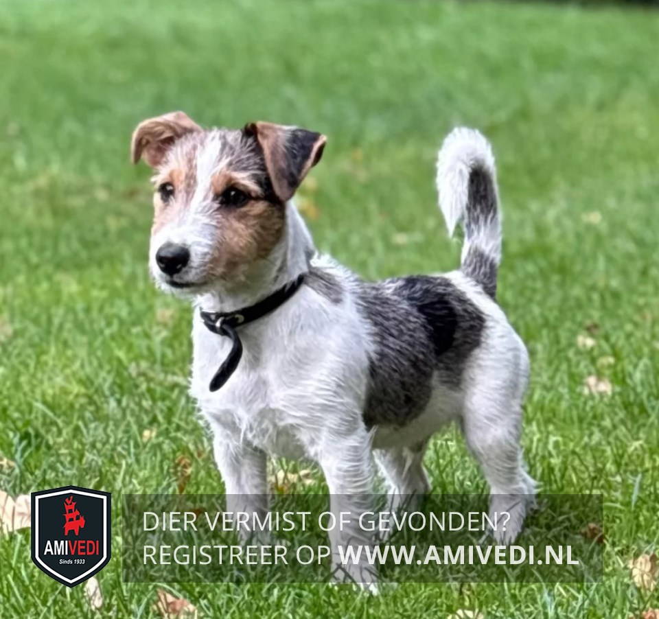 | Signalement | Wit/grijs/bruin gevlekte Jack Russell. Op zijn kopje bruin met zwarte stipjes. Witte poten. Grijze vlek op zijn heup met daarin zwart. |