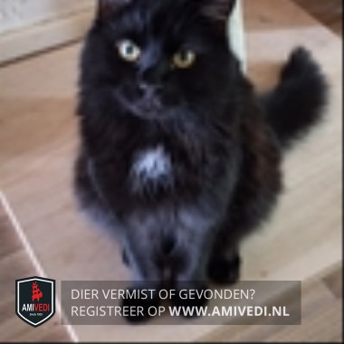| Signalement | Zwarte kater met een klein plekje wit op de borst. |