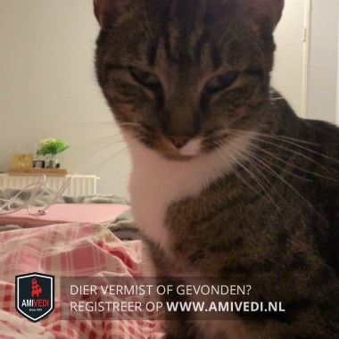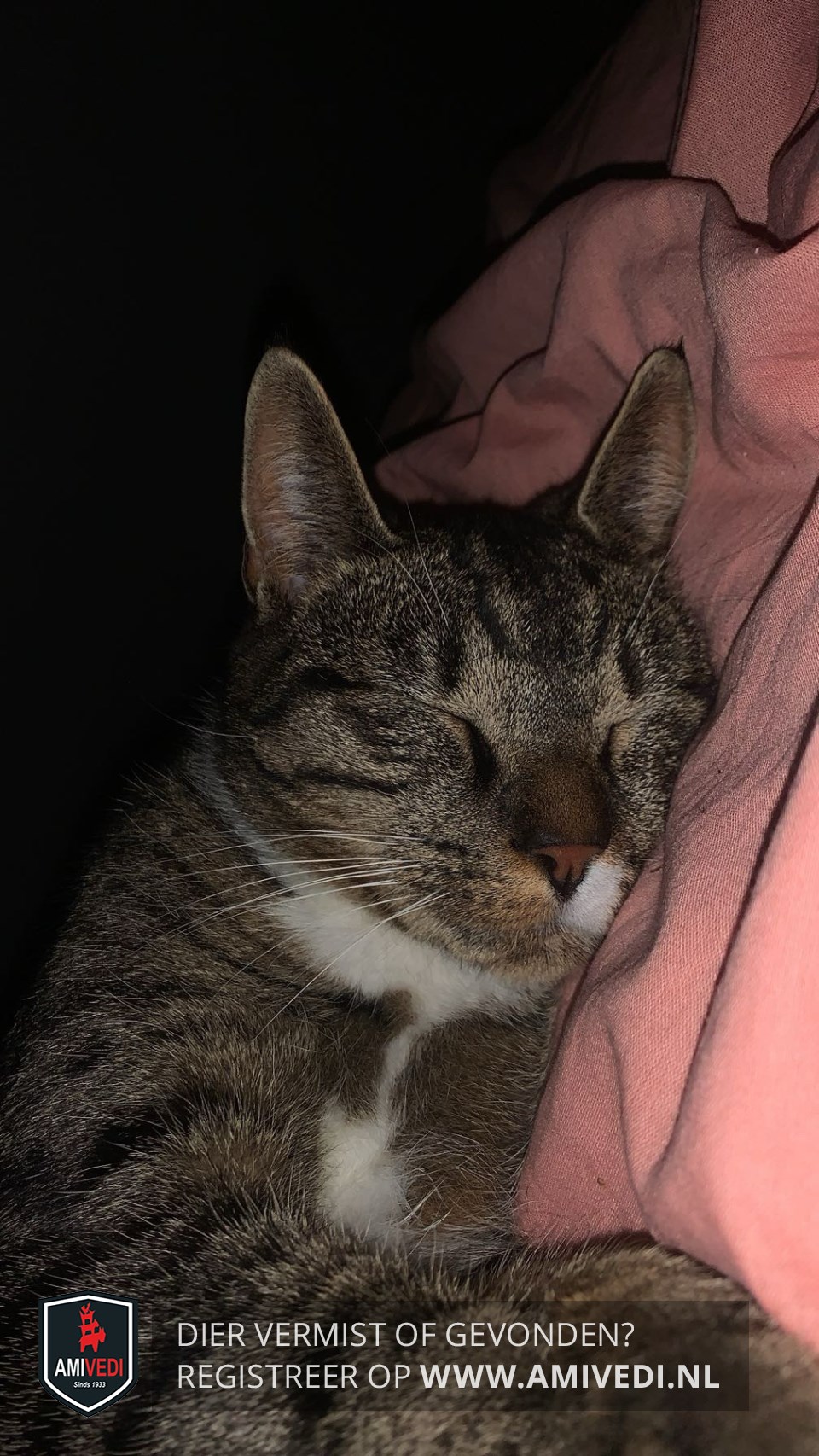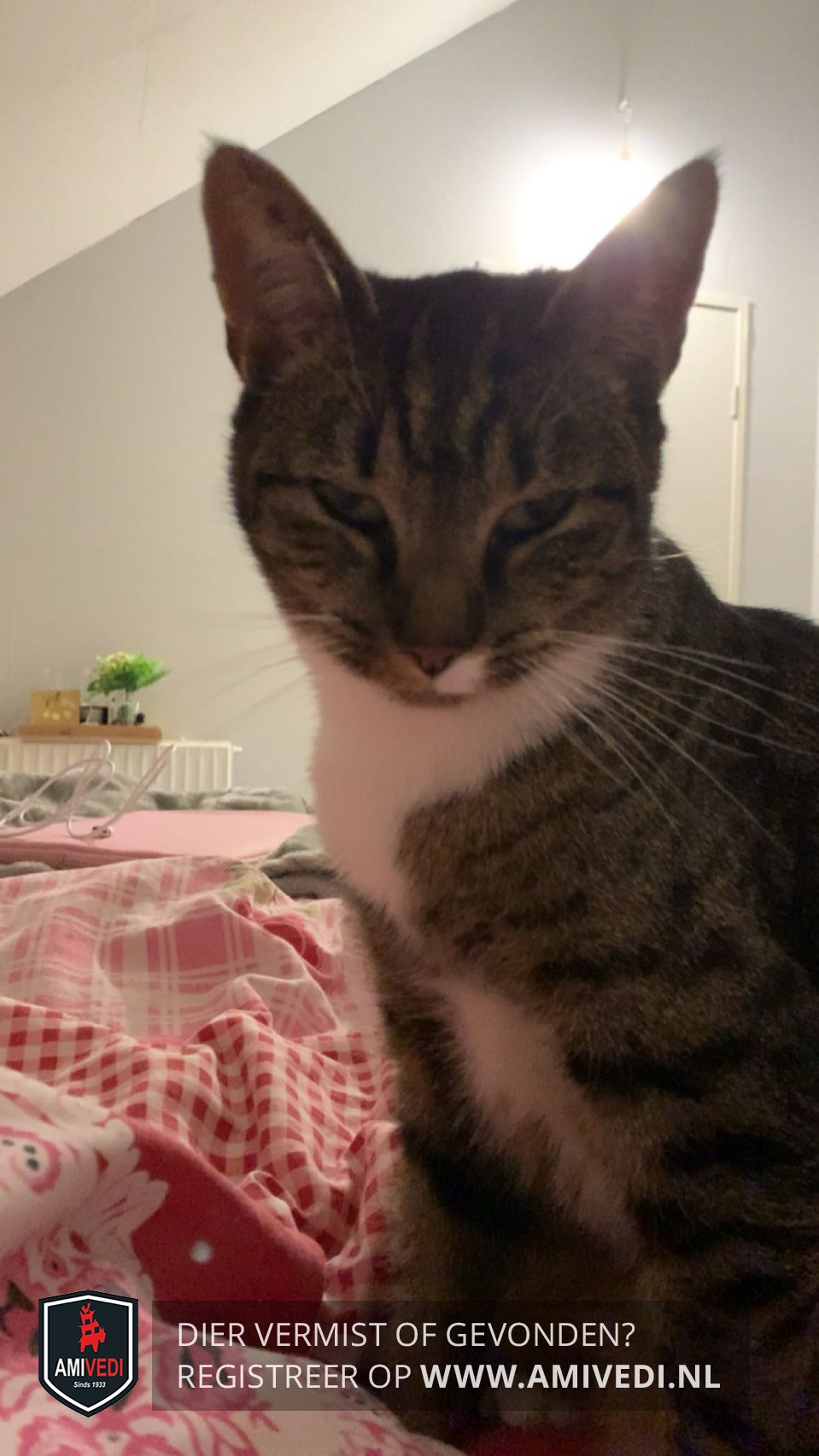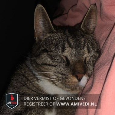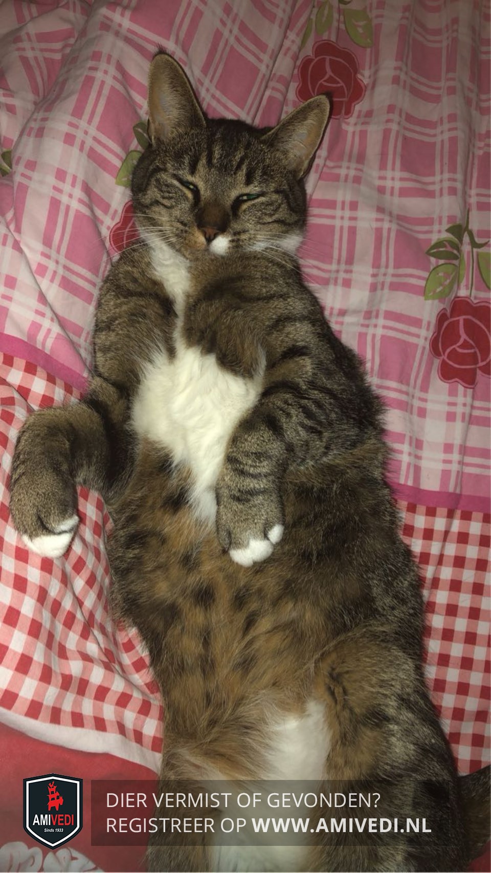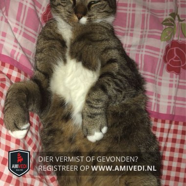| Signalement | Cypers bruin - zwart met wit, cyperse oren en kopje, wit vlekje links onder de neus, bruin vlekje rechts onder de neus, witte bef en borst, witte teentjes voorpoten, witte buik, rechter achter poot is wel bijna helemaal wit, cyperse rug en staart. |