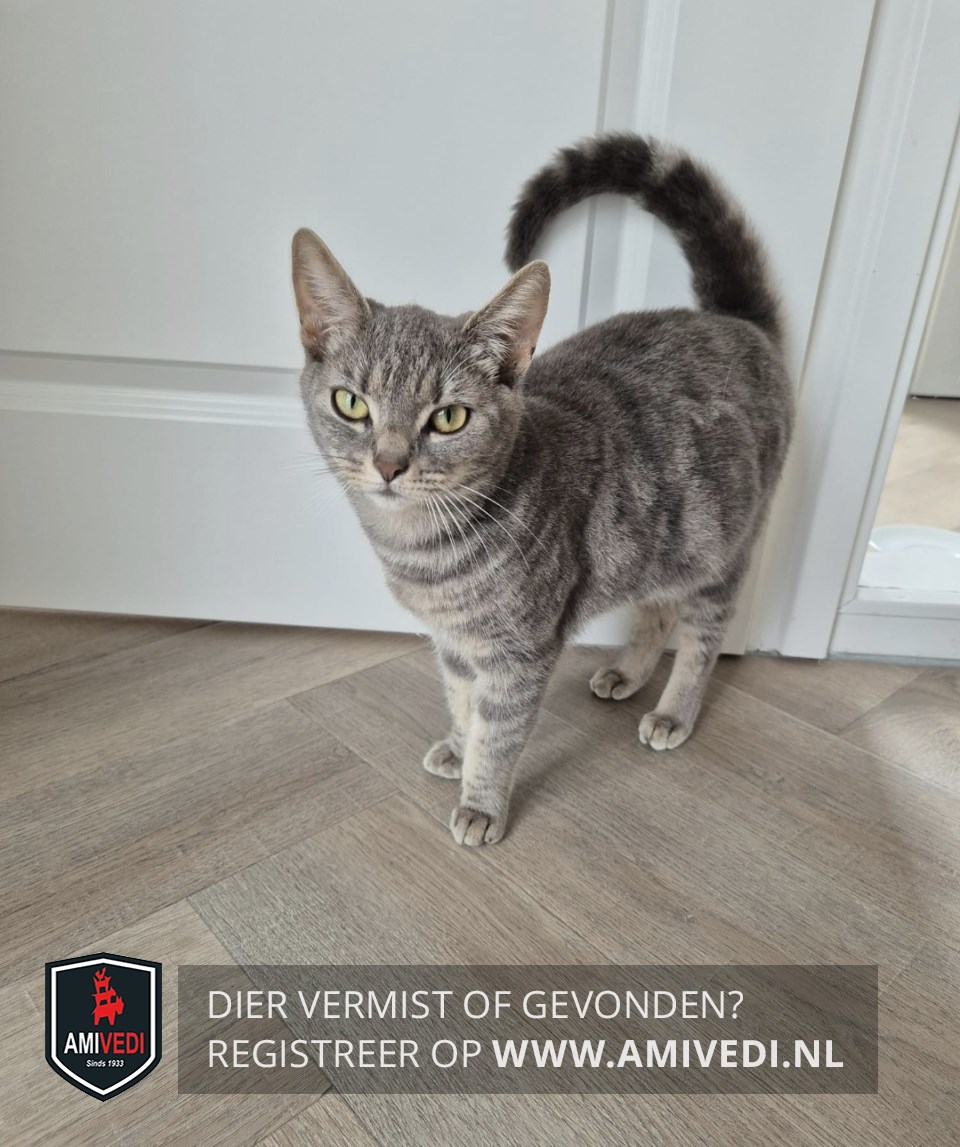 | Signalement | Kruising cypers grijs met donker grijs gestreept en wit kinnetje, Staart donker grijs met lichte ringen. |
