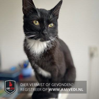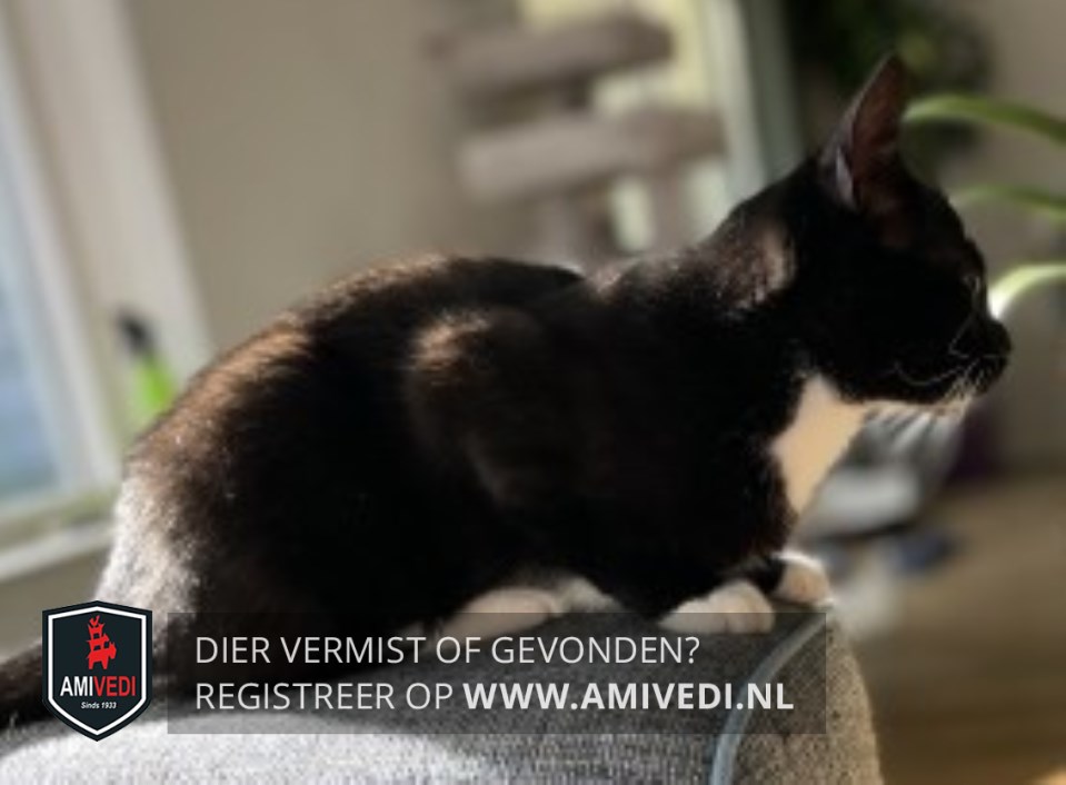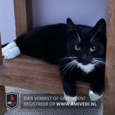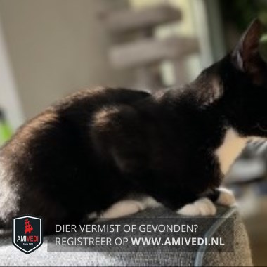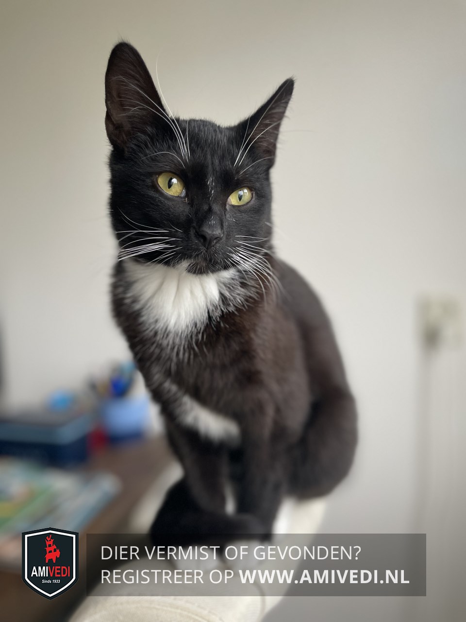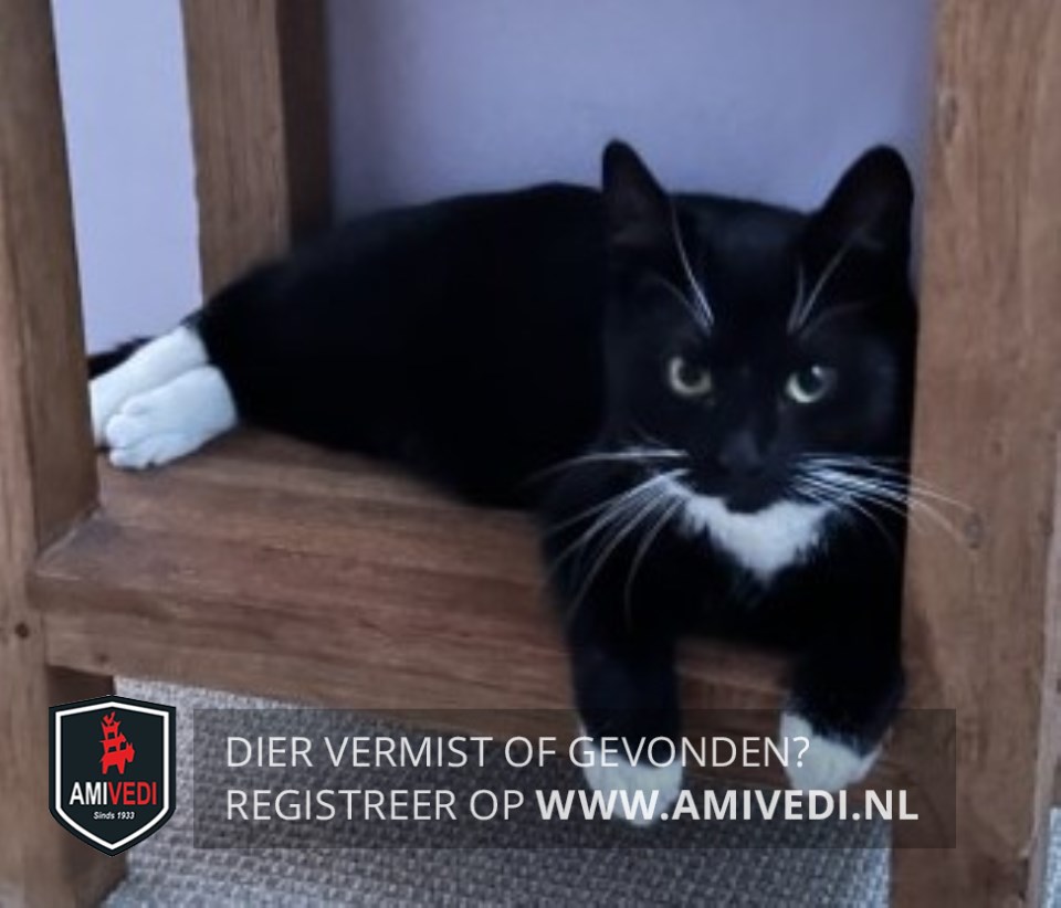 | Signalement | Kater, klein van afmeting. Voornamelijk zwart; met witte kin en bef en witte plek op buik. Verder witte snorharen. Voorpootjes hebben witte voetjes, achterpootjes witte voetjes. |