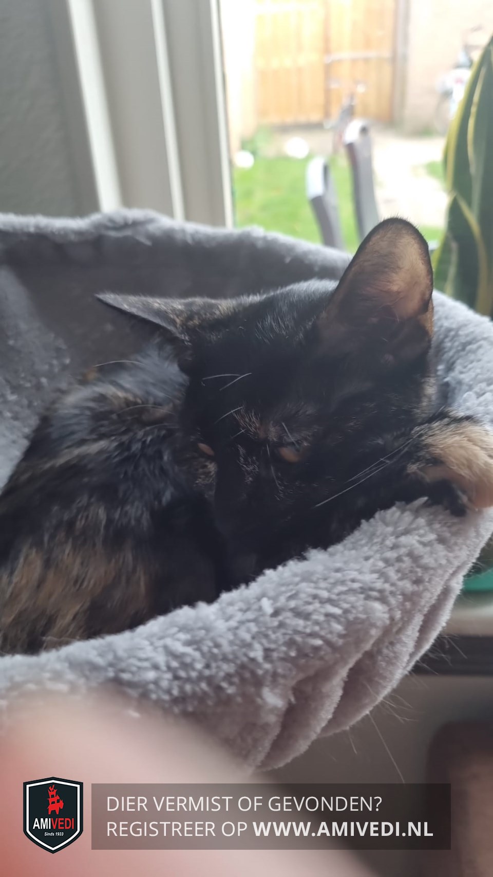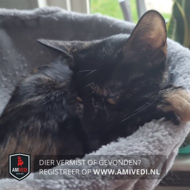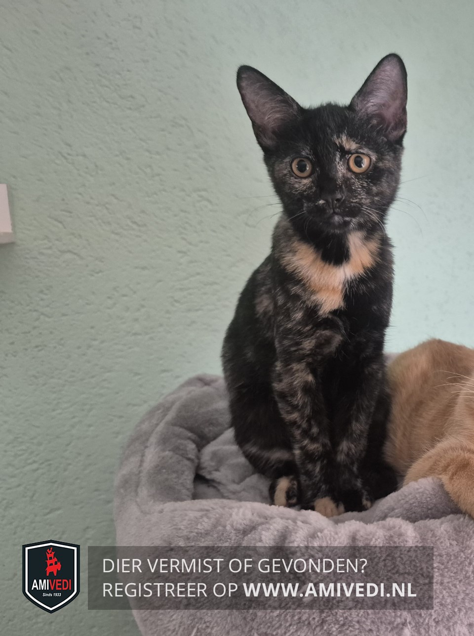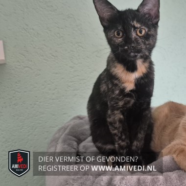| Signalement | Schildpad zwart- bruin- beige, zwart kopje met kleine rode vlekjes bij de ogen, beige tenen voorpoten, rode bef, lijf zwart met rood gemêleerd, slank gebouwd. |