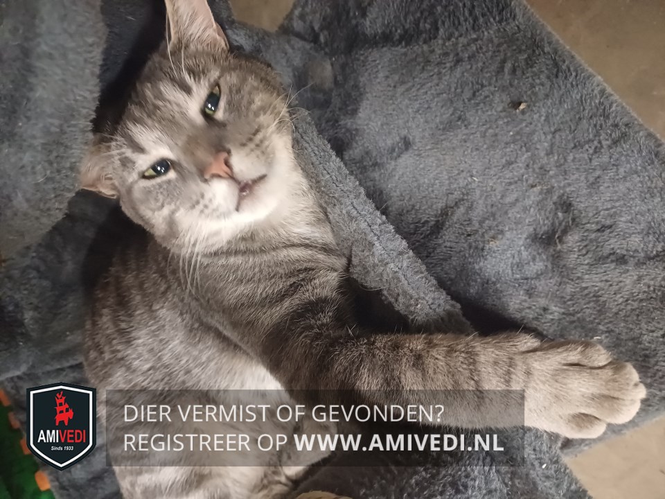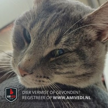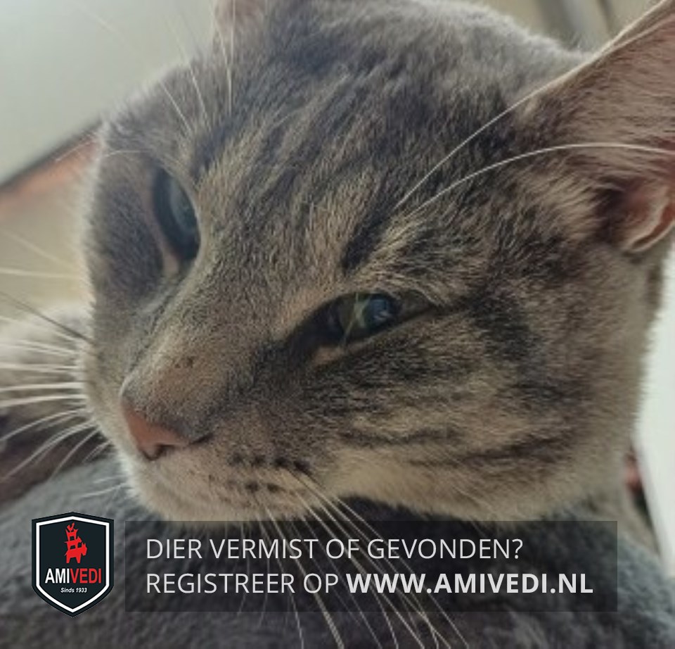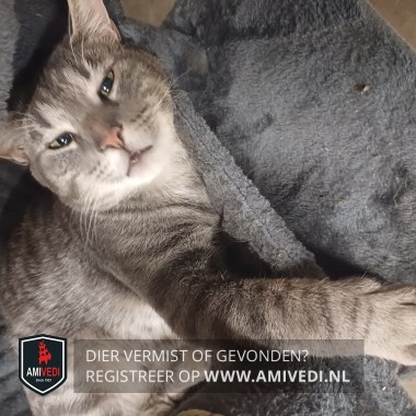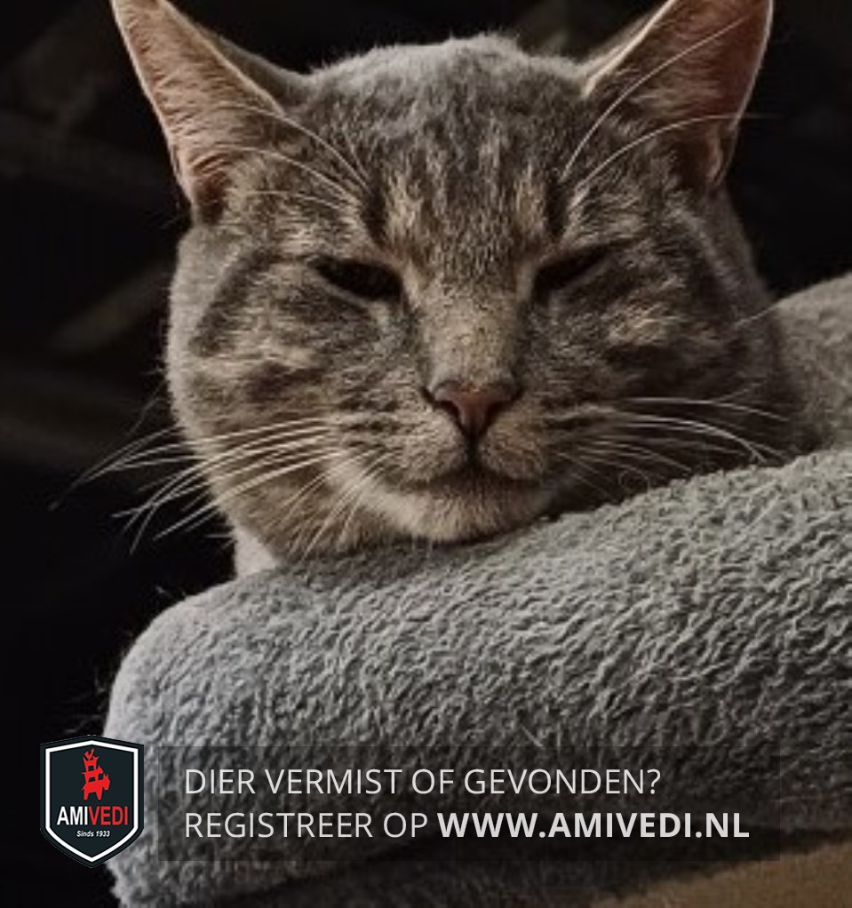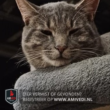 | Signalement | Cypers, rond het bekje wat lichter. Bij de rechter achterpoot zit een beschadiging als een soort gaatje. |
