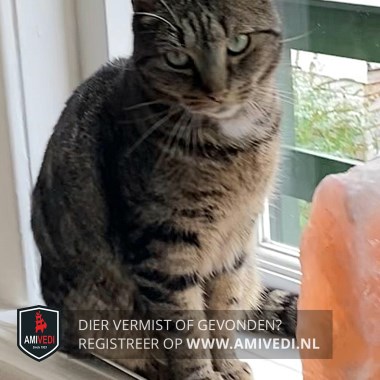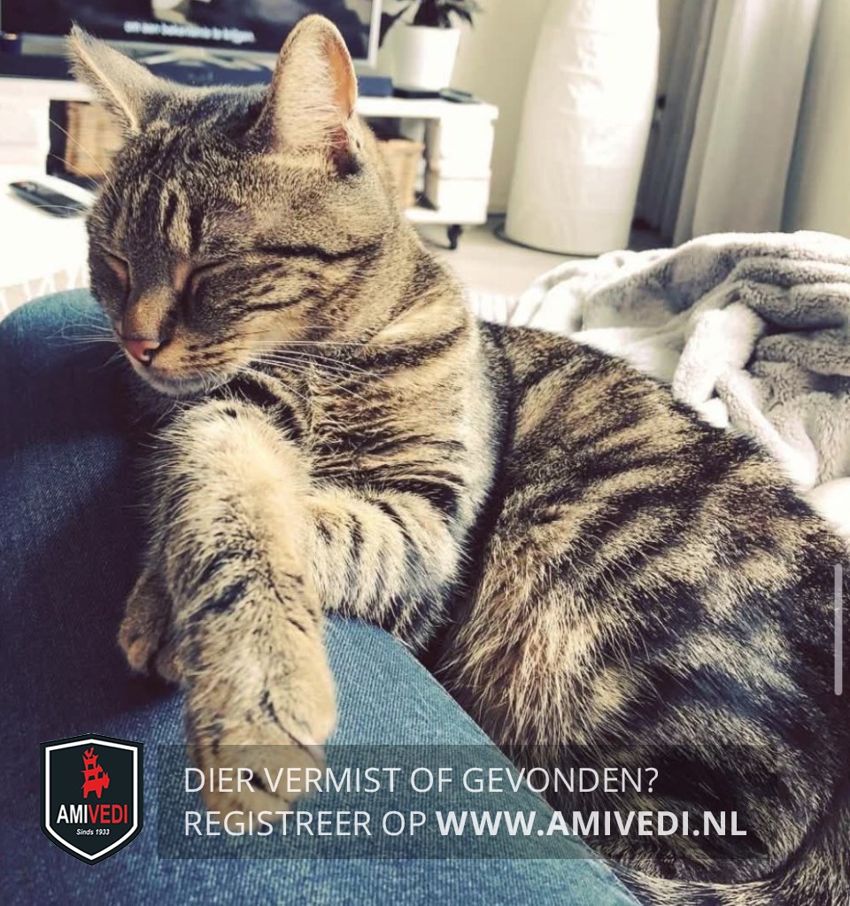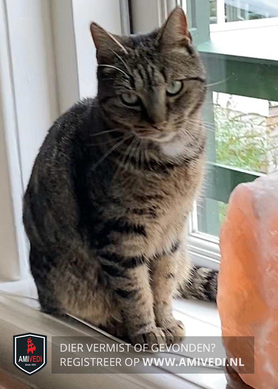 | Signalement | Cypers bruin-zwart gemarmerd met wit. Geheel cypers, alleen een klein wit befje. Groene ogen |