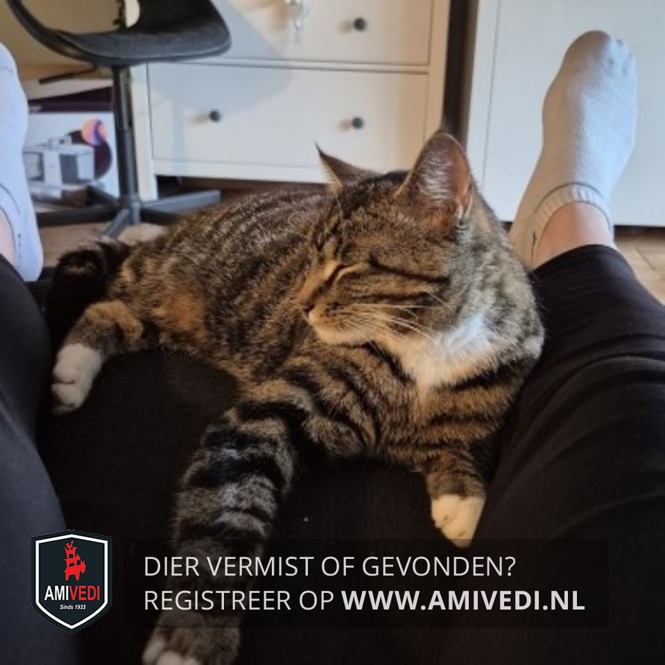 | Signalement | Cypers grijs/zwart met wit. Witte kin en bef. Witte voetjes. Bij de buik en binnenkant achterpoten bruine ondertoon. Linkerkant van de hals is het haar wat korter doordat het afgeschoren is geweest door de dierenarts. |