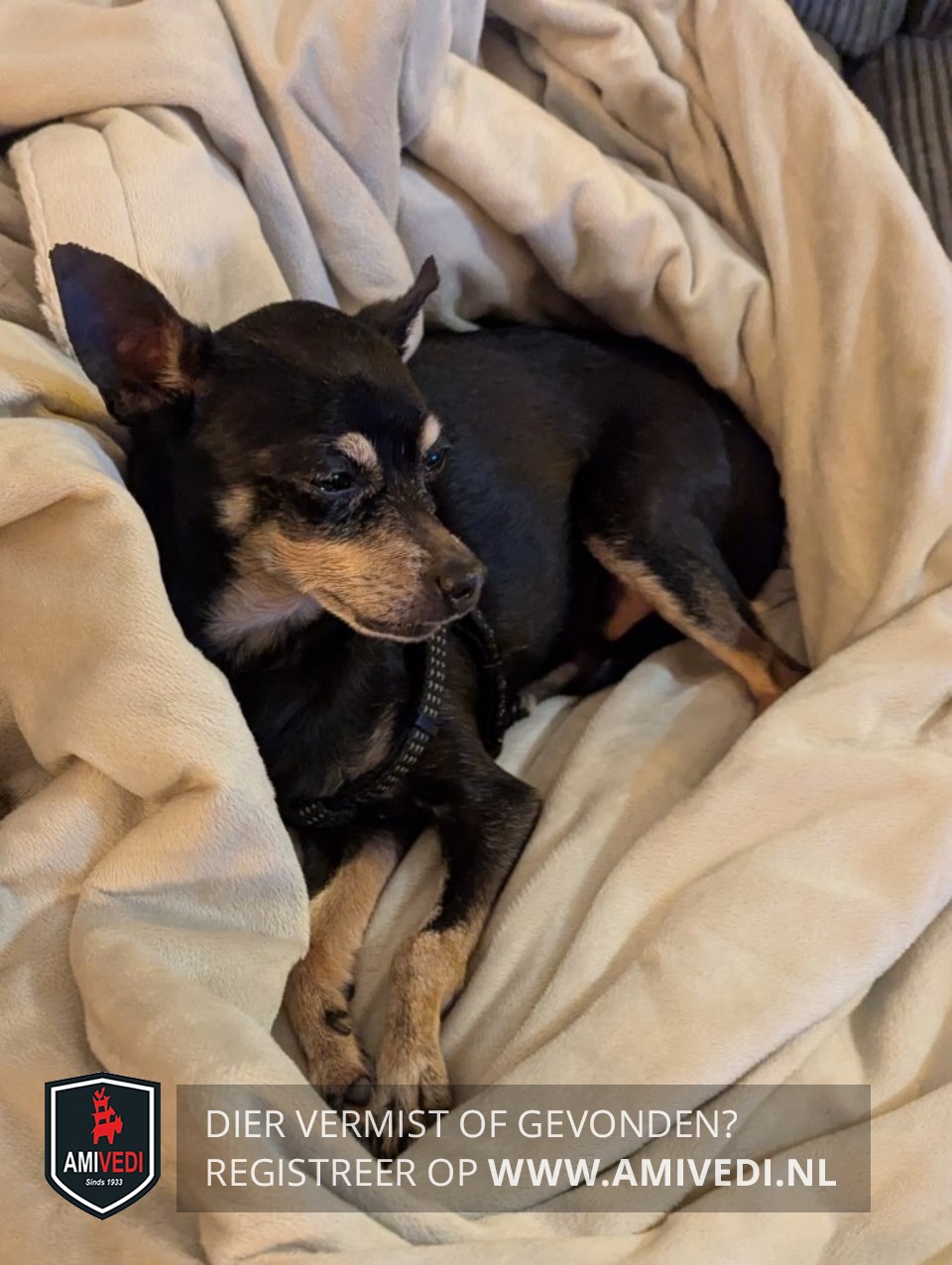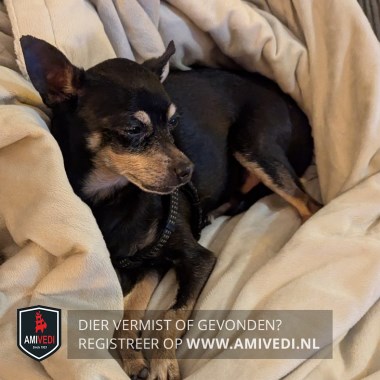 | Signalement | Dwergpinscher, zwart met bruin snuitje, 2 bruine vlekjes boven de ogen, 1 klein bruin vlekje op rechterwang. Bruine keel. Voorpootjes bruine kniekousen, linker achterpootje bruin. Draagt een zwart tuigje! |
