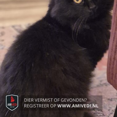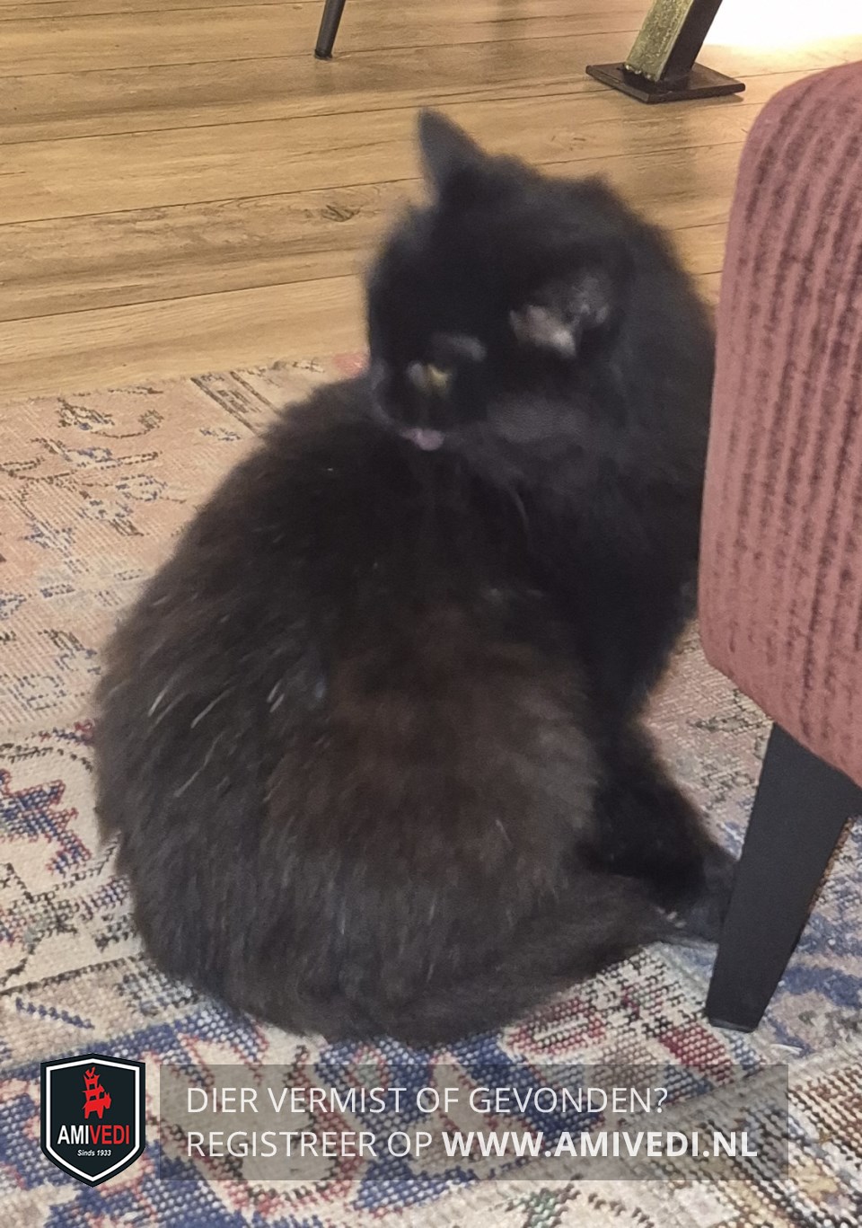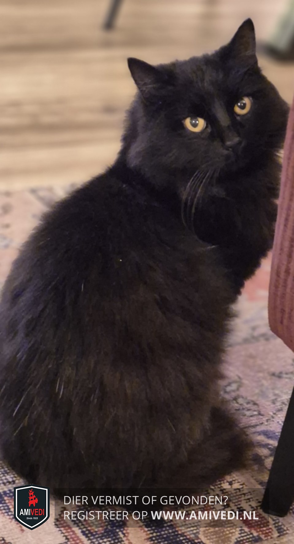 | Signalement | Geheel zwart, langharig, gele ogen, vacht op de staart en staartaanzet is dunner. |