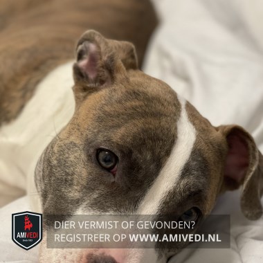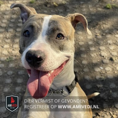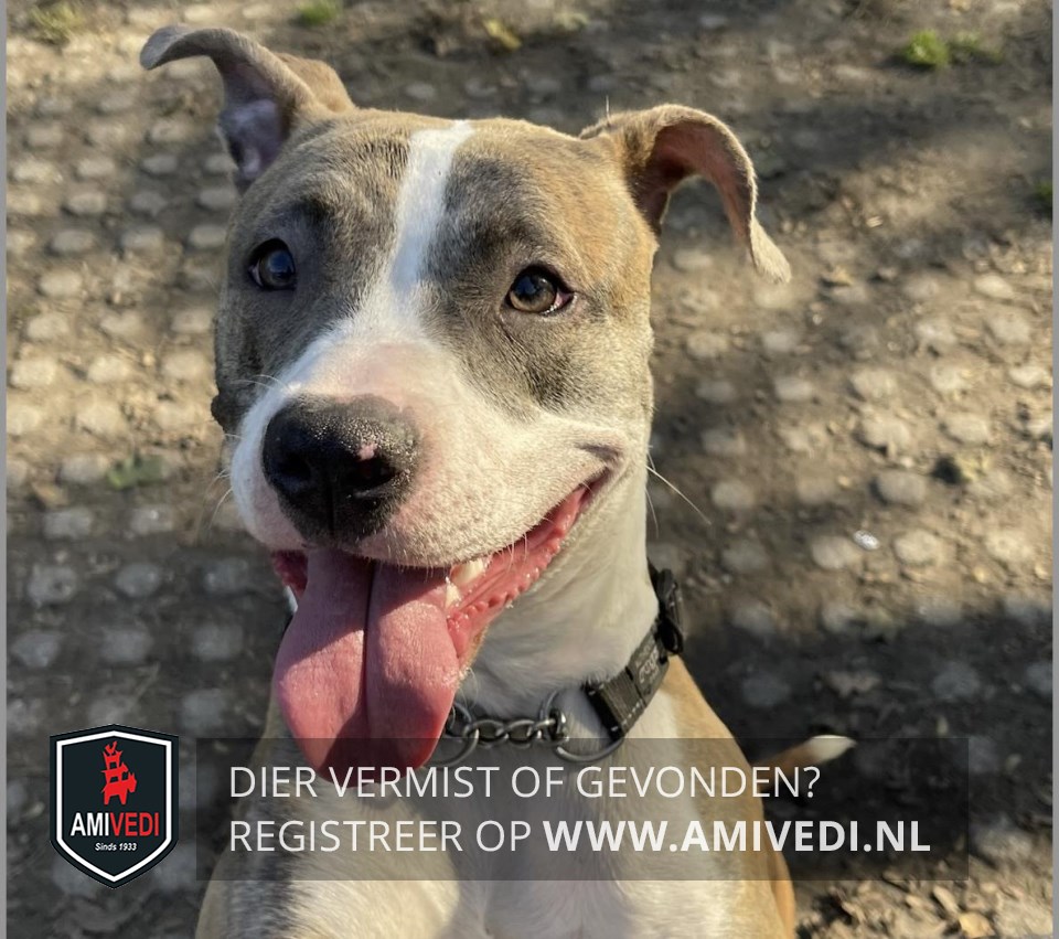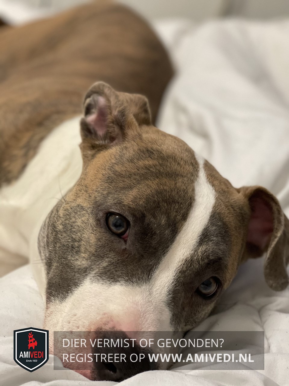 | Signalement | Bruin gestroomd met wit. Witte snoet en bles. Witte hals en borst Witte voorpoten. Bruin rond de ogen. bruine oren Rug is bruin gestroomd. Amerikaanse Stafford. |
