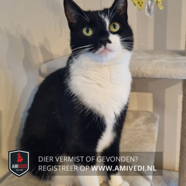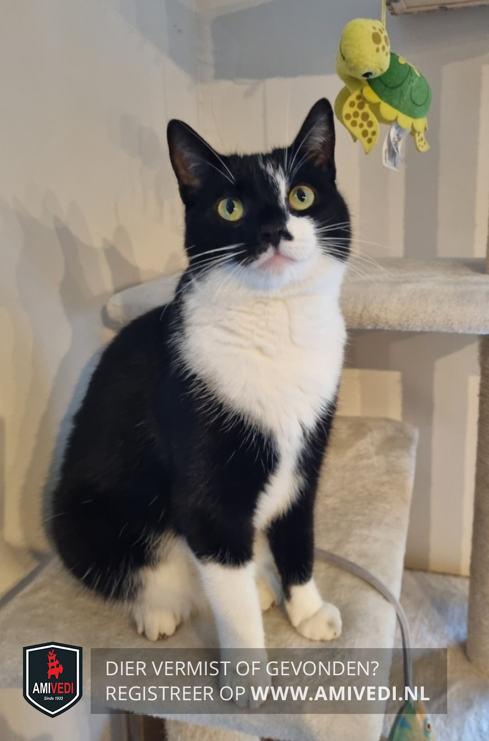 | Signalement | Zwart/wit. Rechterkant neus en gezicht is zwart. Linkerkant neus (bek) is wit met een smalle bles. Zwarte rug. Witte kin en bef die doorloopt tot over de borst. Witte laars rechts voor. witte sok links voor (achter poten ook met wit) |