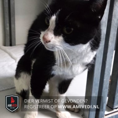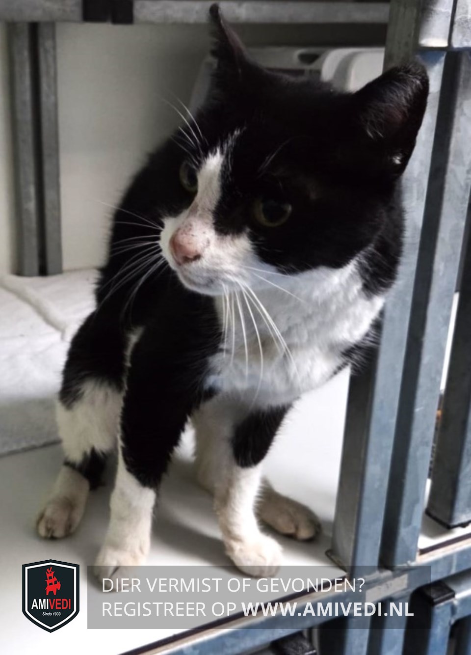 | Signalement | Zwart met wit. Voornamelijk zwart, witte streep tussen de ogen doorlopend over de neus, witte snoet, witte snorharen, roze neusje, kin en hals wit, witte bef doorlopend naar de onderkant, voorpoten aan de voorkant witte sokken, aan de achterkant wit, onderlijf wit, rechts achter op de knie wit, rechter achterpoot witte sok, linker achterpoot meest wit. Oud, kale plekken op de kop, vieze vacht. |