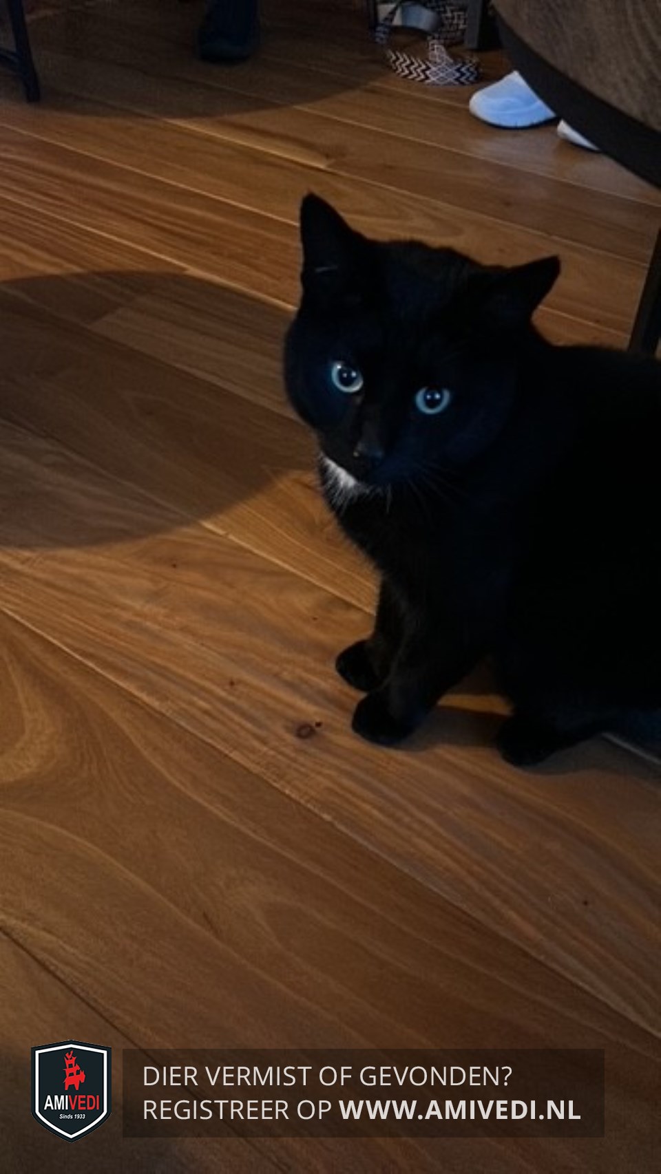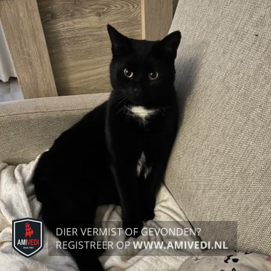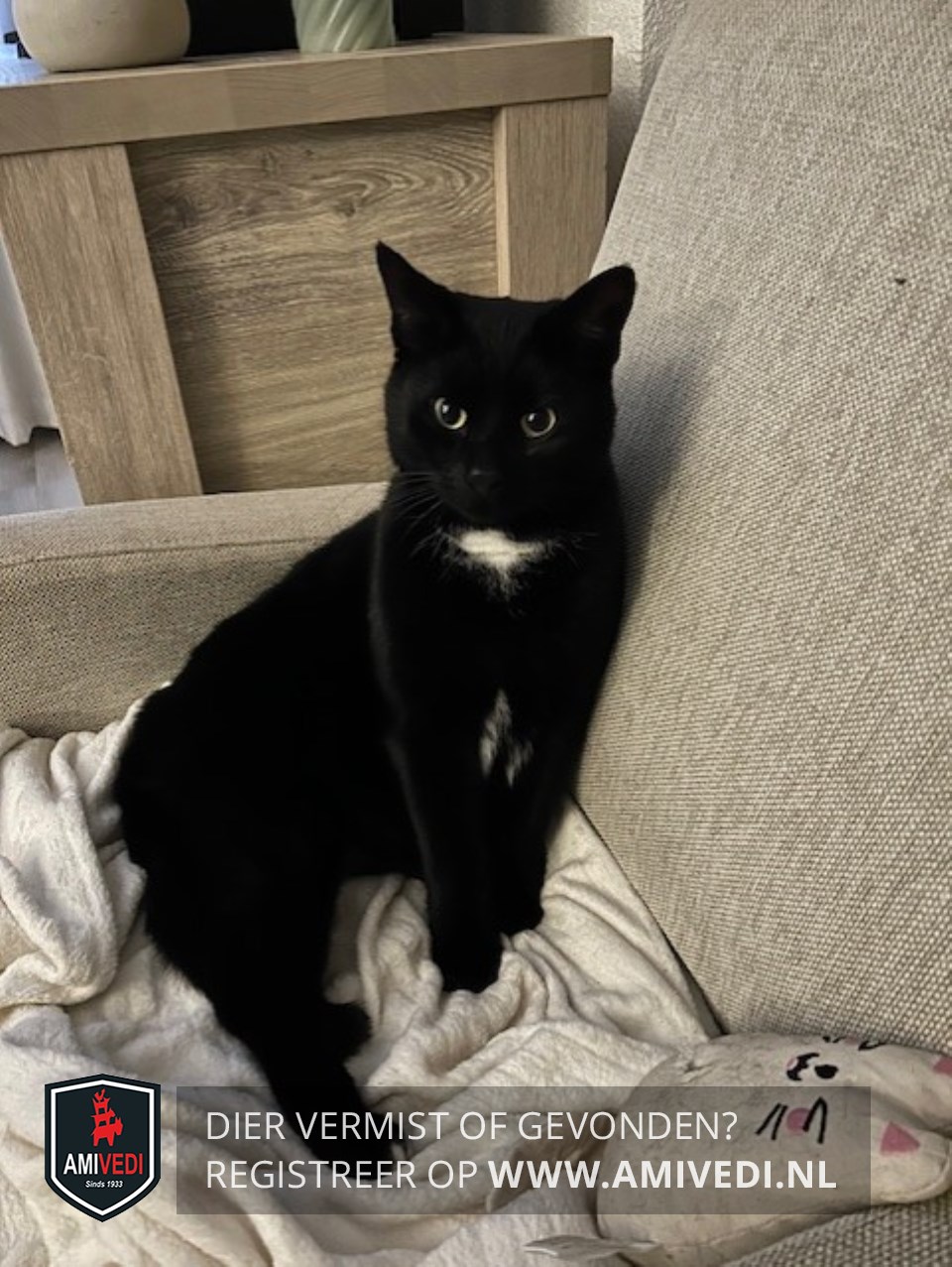 | Signalement | Zwart met wat wit. Hoofdzakelijk zwart. Wit befje en wat witte haren op de borst tussen de voorpoten. Twee witte tenen rechts achter. |