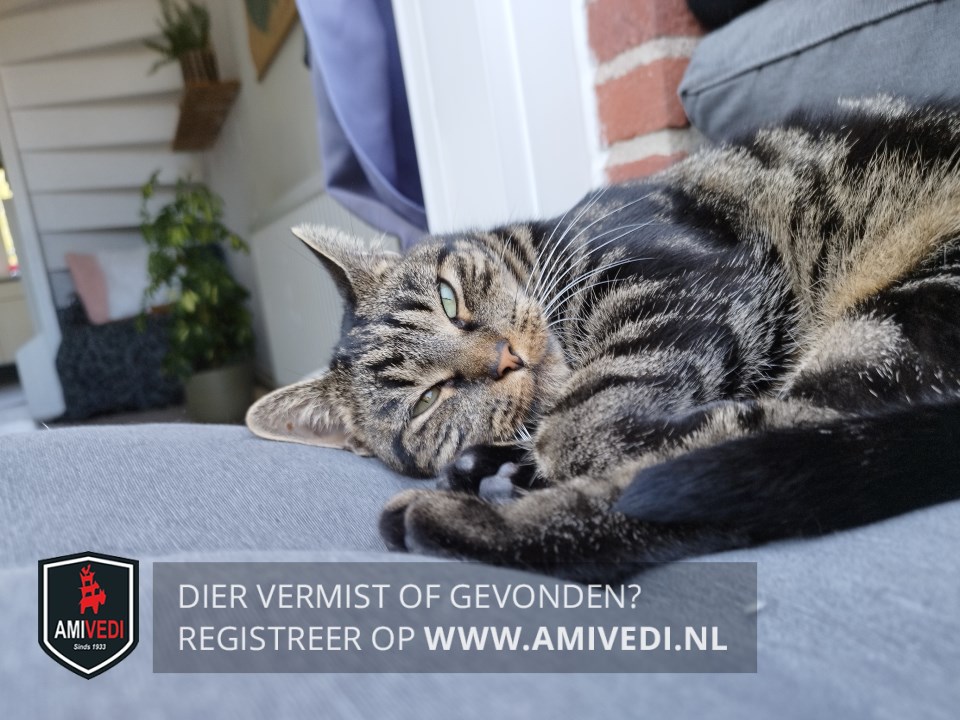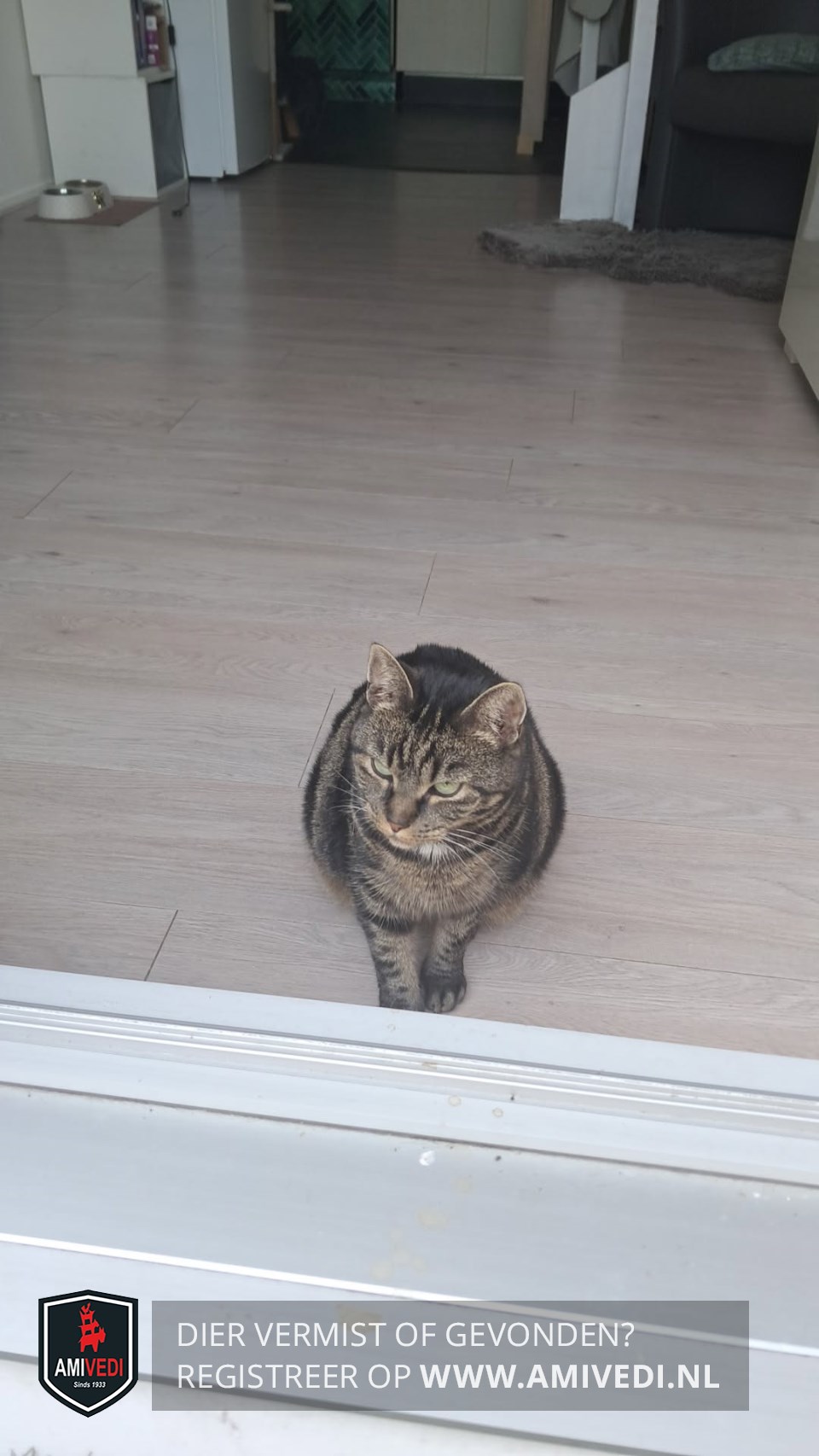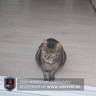 | Signalement | Cypers grijsbruin met zwart gestreept met een wit vlekje op de bef. |