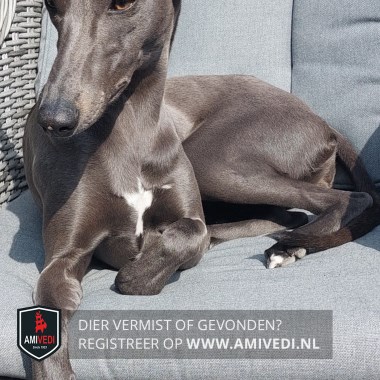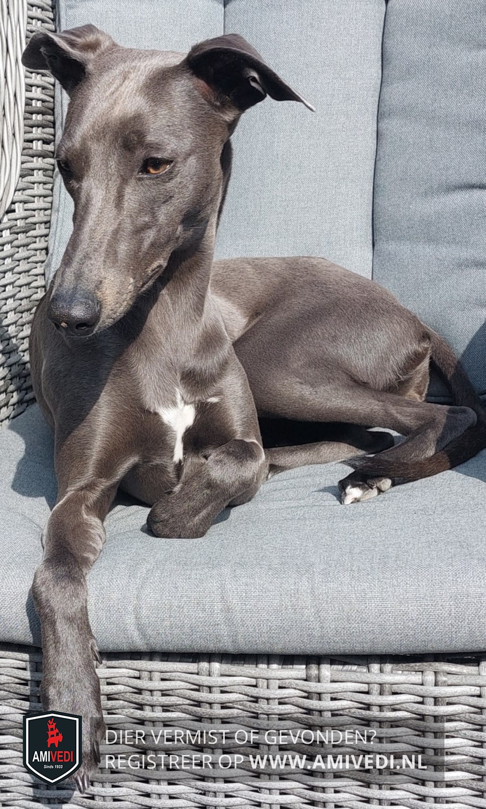 | Signalement | Whippet, grijs met wit plekje op de borst, linker achterpoot wit teentje. |
