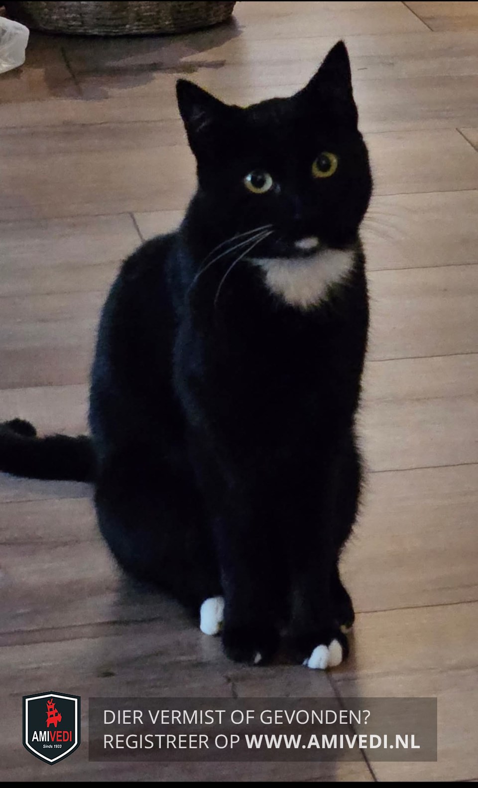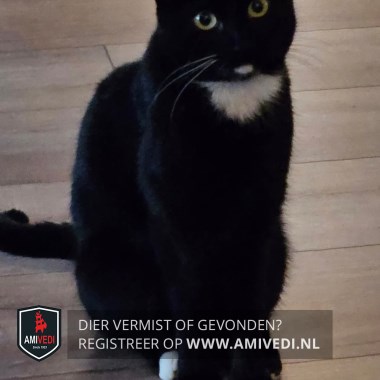 | Signalement | Zwart met een wit stipje op de onder lip, witte bef, rechters witte snorharen, links zwarte snorharen, witte teentjes linker voorpoot, wit stipje op een teentje rechts, witte teentjes rechter achter poot, wit stipje op een teentje links. |