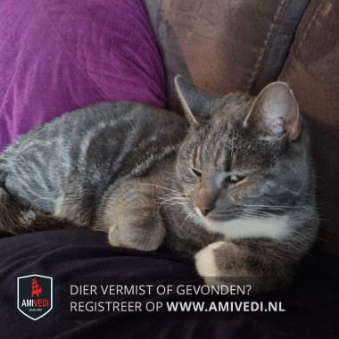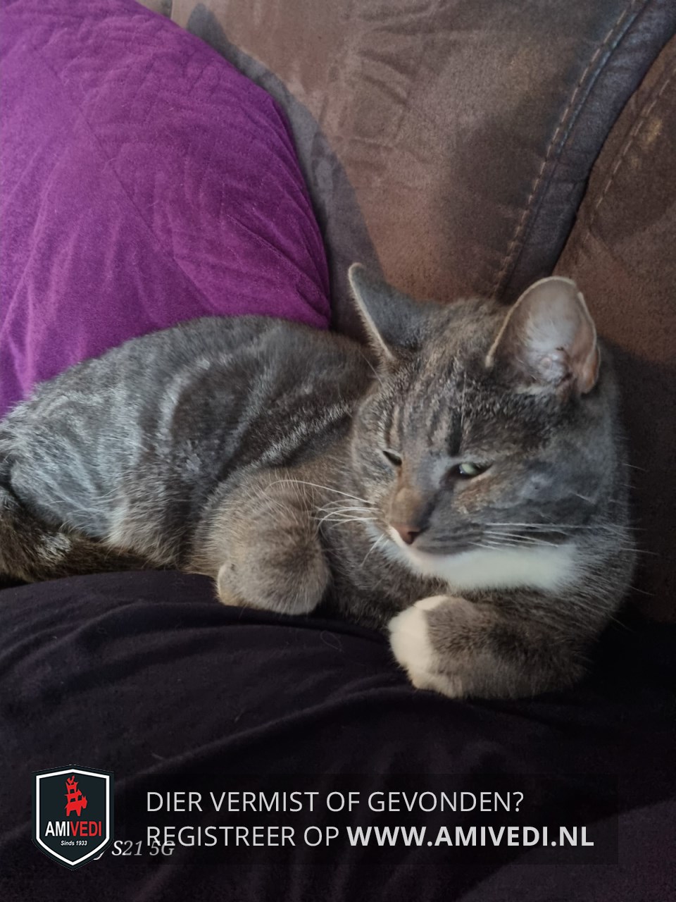 | Signalement | Cypers grijs, wit stipje op de rechter boven lip, witte kin en bef, linker voorpoot witte teentjes, heeft sneetje in haar linker oor. |