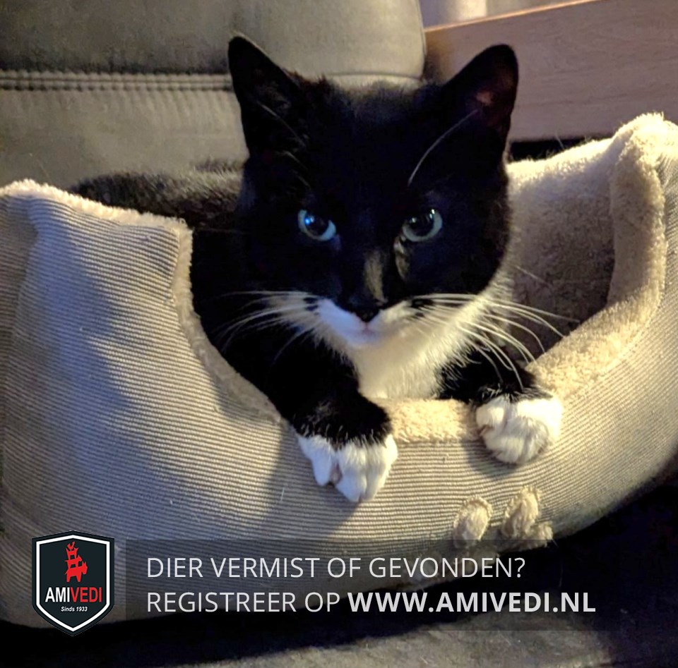 | Signalement | Zwart-witte poes. Witte teentjes, witte snor en bef. |