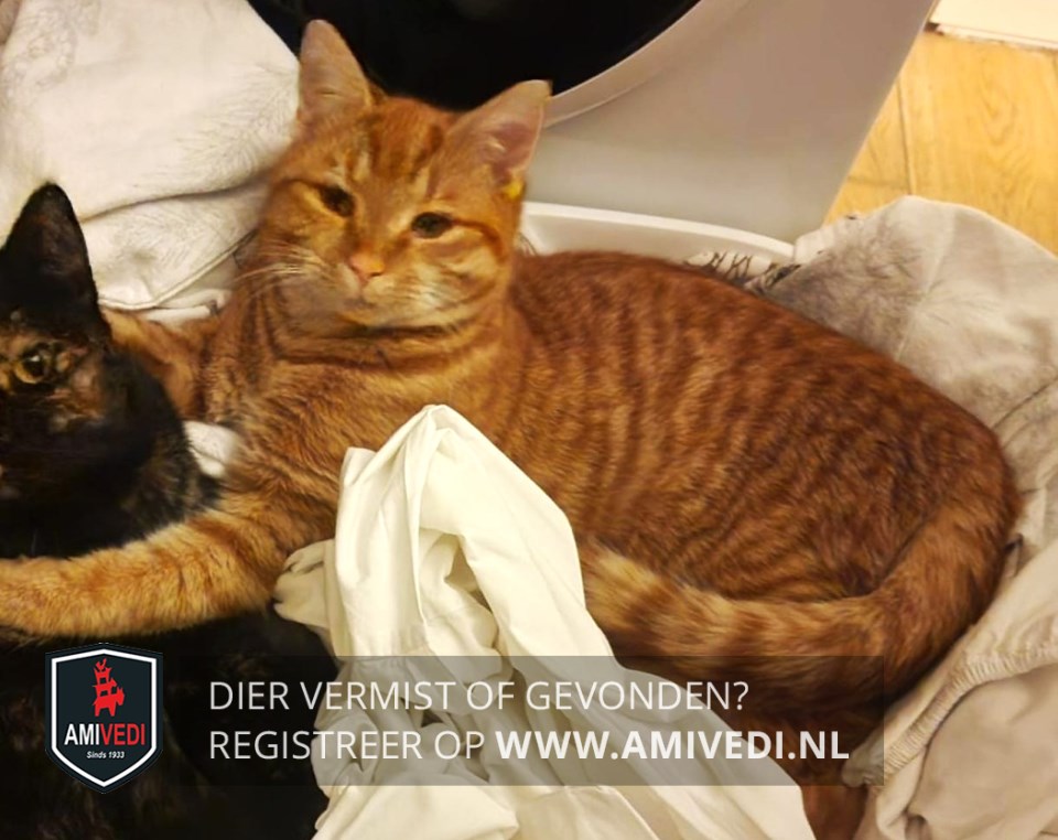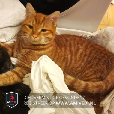 | Signalement | Cypers rood gestreept. Geheel cypers rood gestreept, roze neusje, rond de snoet wat lichtere plekken. Loopt een beetje mank met rechter achterpoot. |