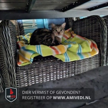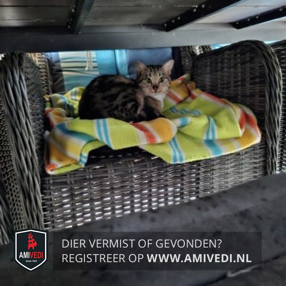 | Signalement | Cypers bruin-zwart gemarmerd met witte kin en bef, voorpootjes witte sokjes, achterpootjes witte laarsjes. Zichtmelding. |