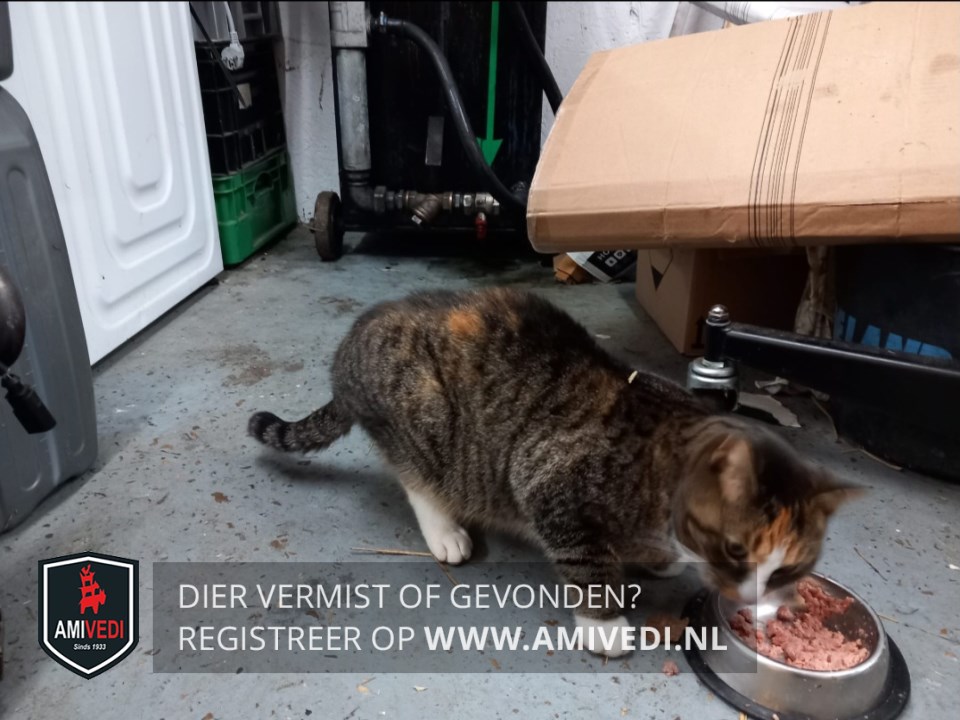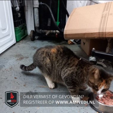 | Signalement | Cypers grijs/zwart met rood en wit. Kop cypers grijs/zwart, rood op het voorhoofd, wit tussen de ogen, rood onder de neus. Witte bef. Voorpoten cypers grijs/zwart met witte voeten, achterpoot rechts witte laars. Rug cypers grijs/zwart, rode vlek op de rug. Staart cypers grijs/zwart. Kleine, schuwe poes. |