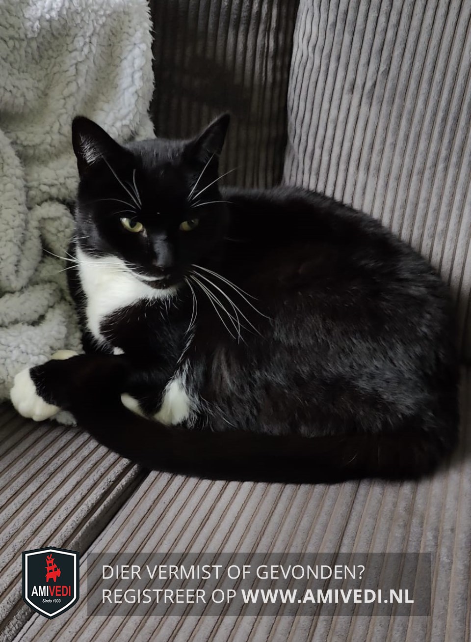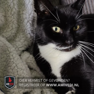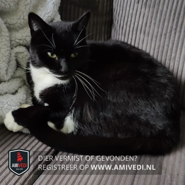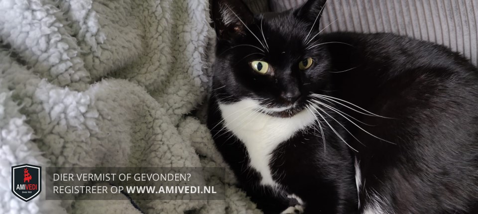 | Signalement | Zwarte poes met witte sokjes voorpoten, Witte laarsjes achterpoten. Witte bef en buik. Witte streep loopt vanaf nek tot aan mondhoek. Witte snorharen. |