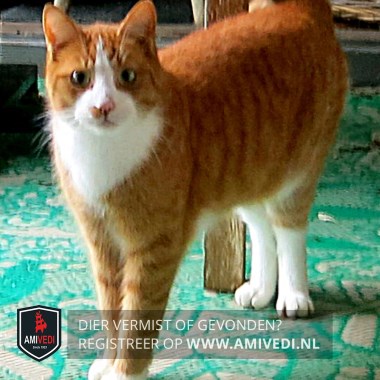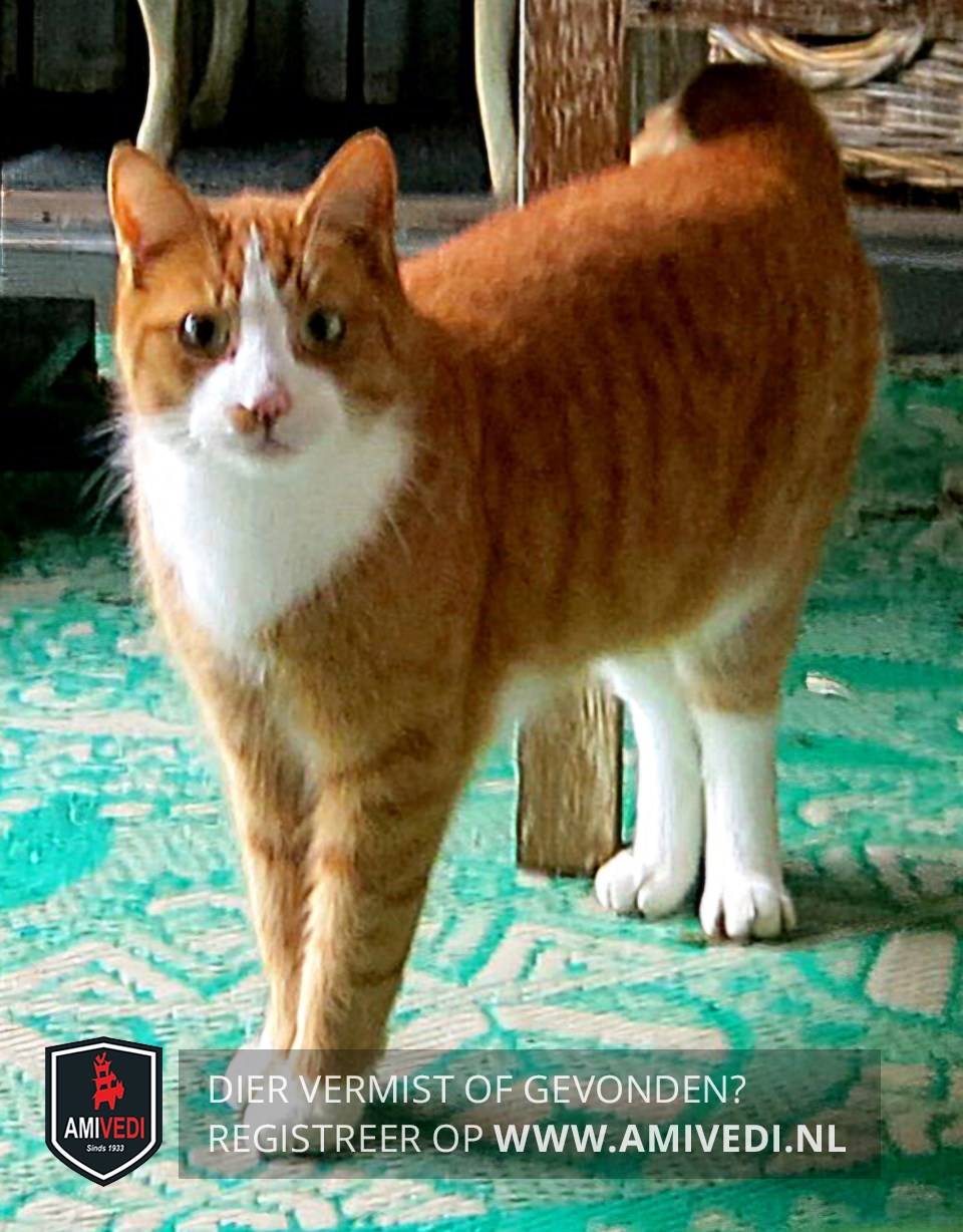 | Signalement | Cypers rood gestreept met wit. Witte snuit met bles. Witte bef en buik. Voor witte voetjes, achter witte laarsjes. Rode vlek rechts onder de neus. Erg lief en al dagen in de tuin. |