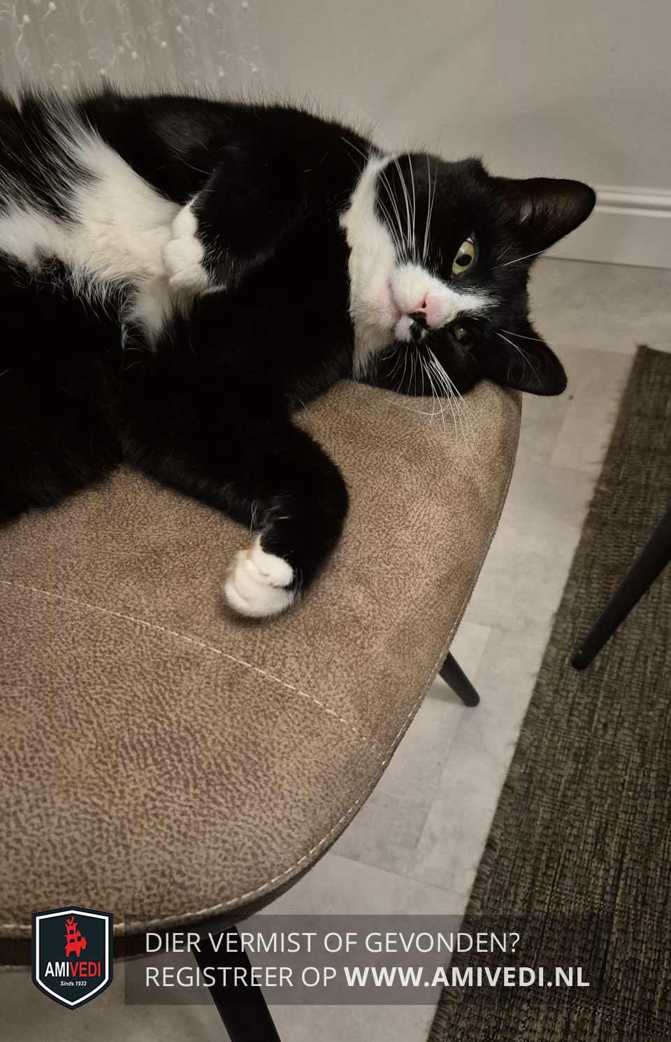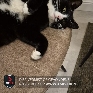 | Signalement | Zwart met wit op neus en snuit, zwart plekje onder neus, witte kin, bef en nek, witte plek op nek, voorpootjes witte teentjes. |
