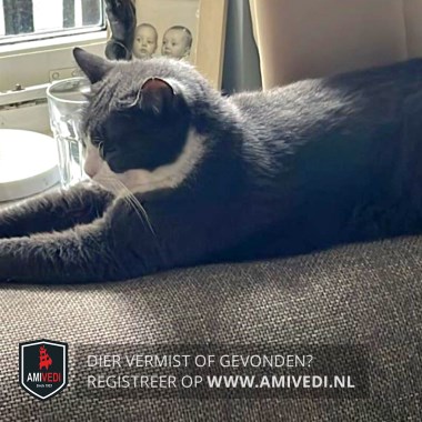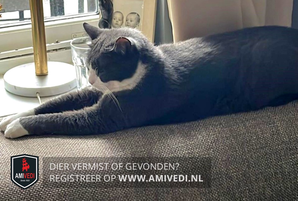 | Signalement | Zwart-witte kater. Witte snuit, kaken en bef. Rechtsvoor een wit sokje en linksvoor een wit voetje. |