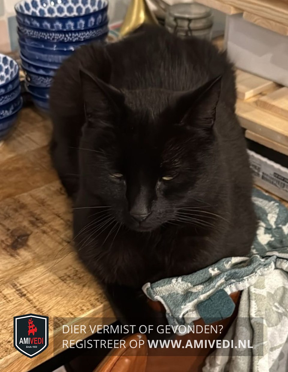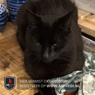 | Signalement | Compleet egaal zwarte kat, ook geen witte/ lichte kussentjes |