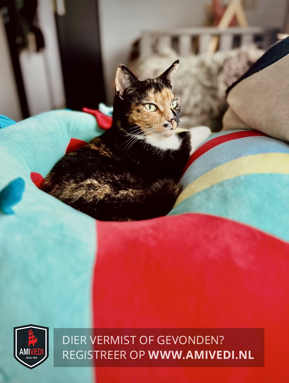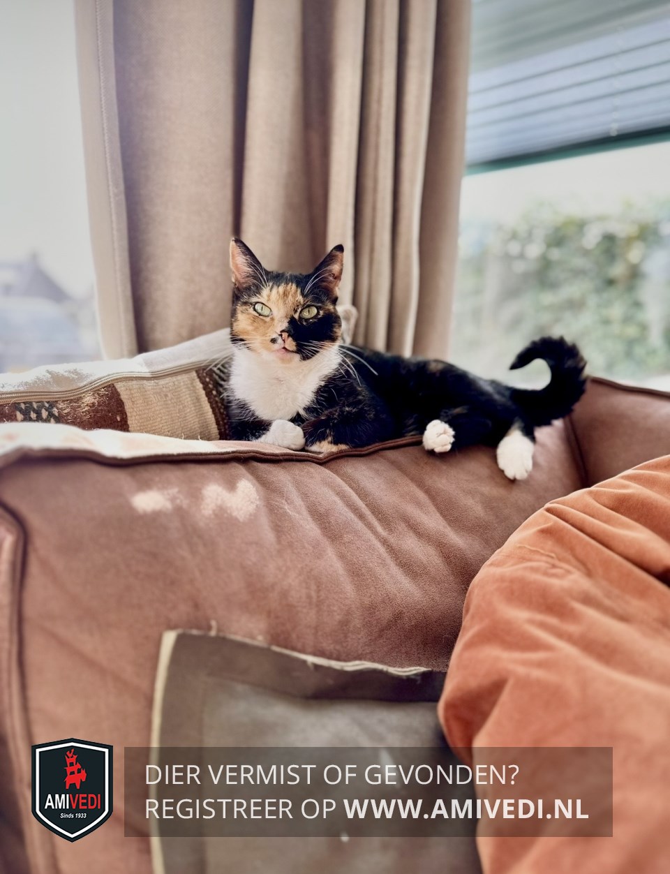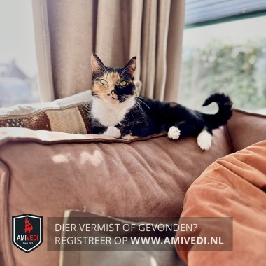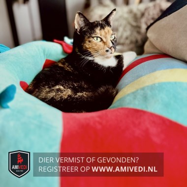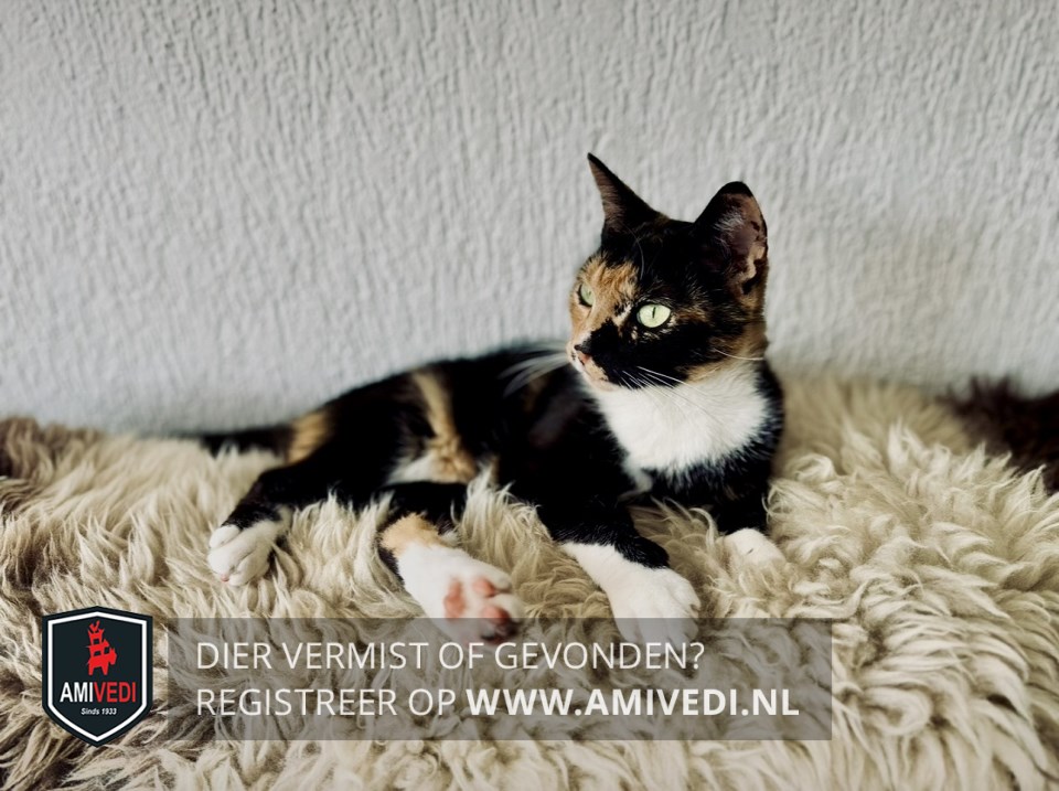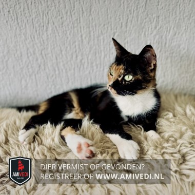 | Signalement | Lapjes poes. Rechterkant kopje is rood/oranje. Linkerkant is zwart net als de oren. Zwart puntje op de rechterlip. Witte bef. Lijfje overwegend zwart met een rood/oranje streep over de flank. Aanzet staart is ook oranje/rood. Witte sokken. Staart is zwart. |