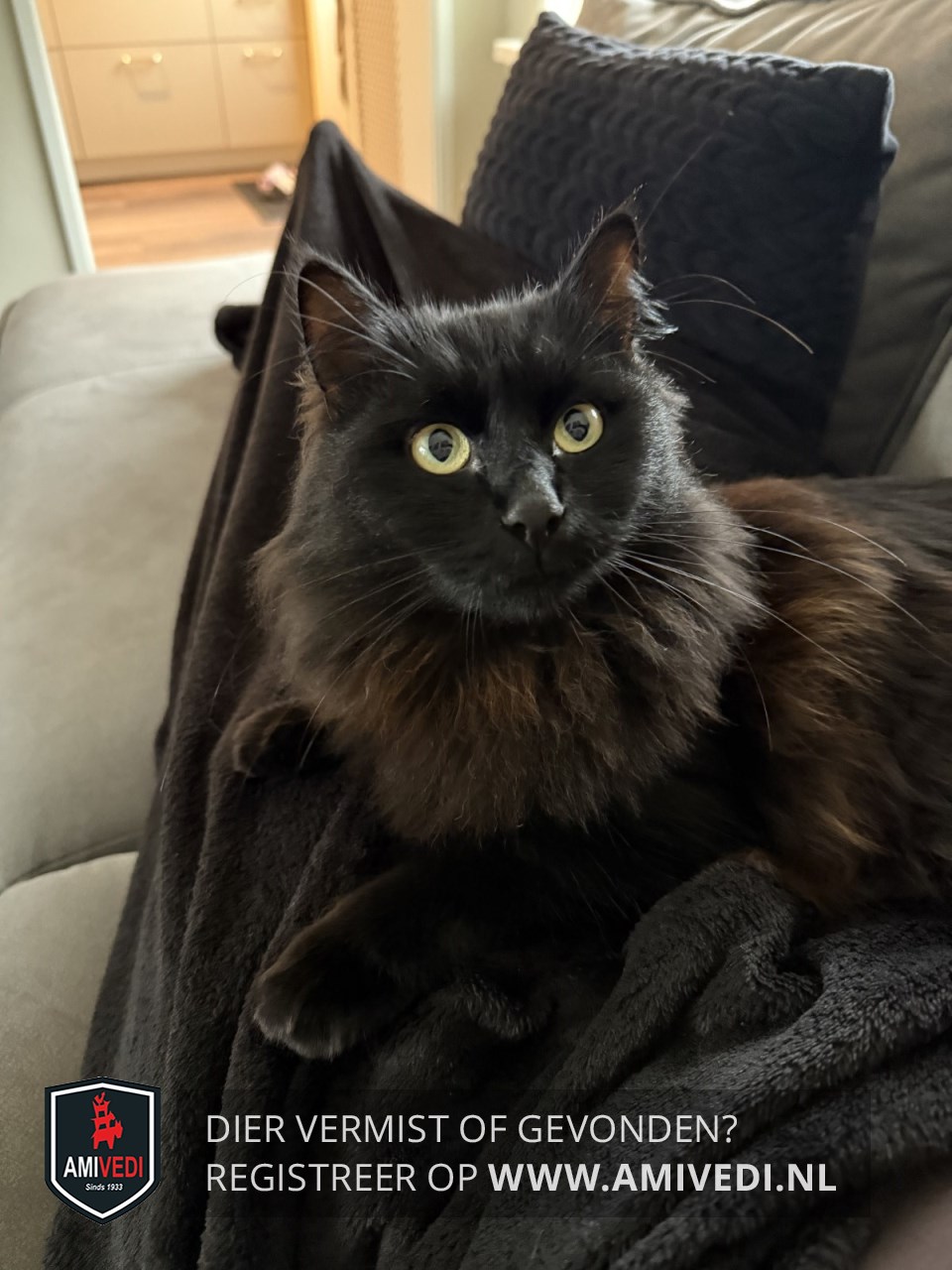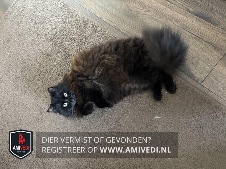 | Signalement | Volledig zwart met een gladde langharige vacht met grote kraag gele ogen |