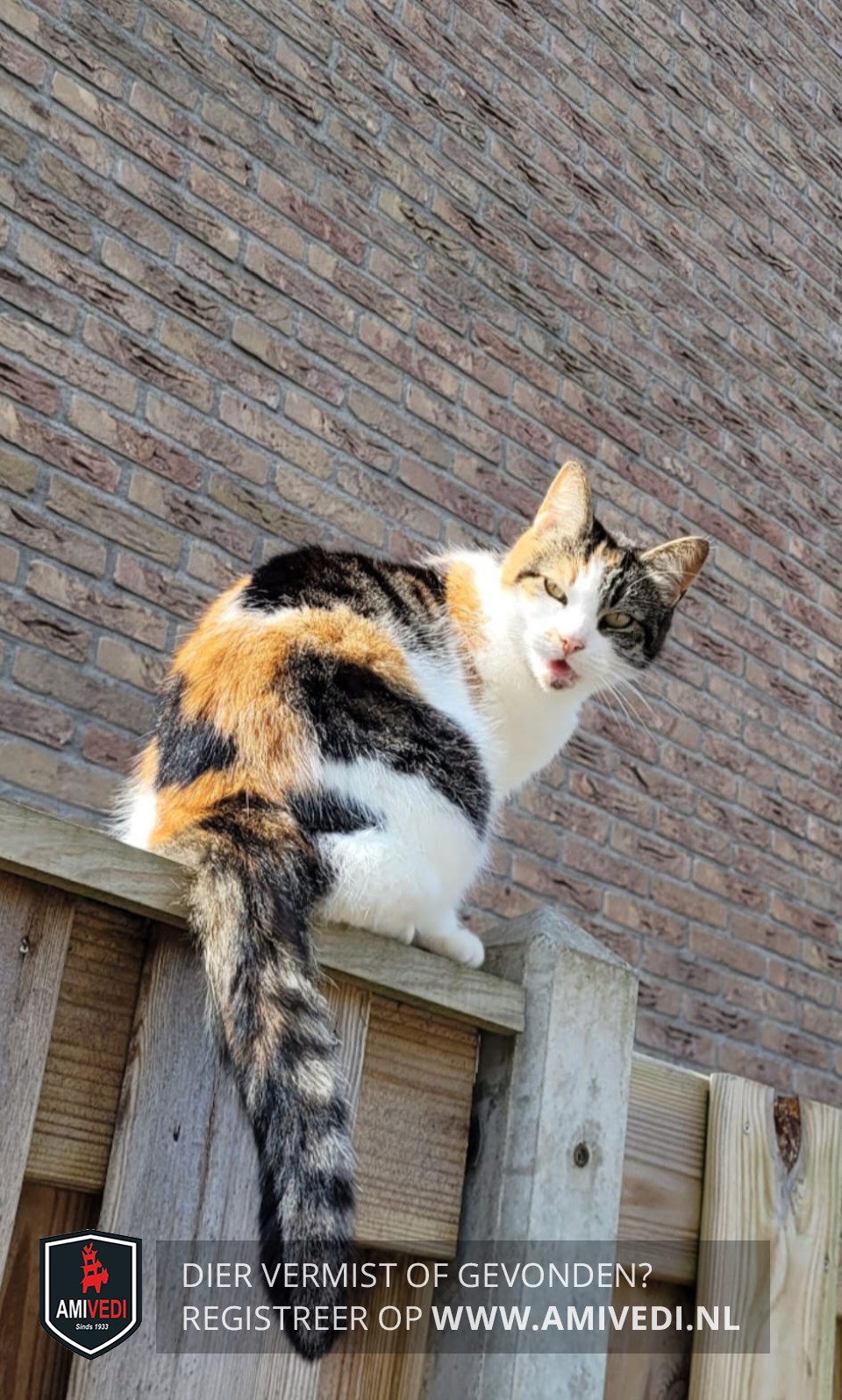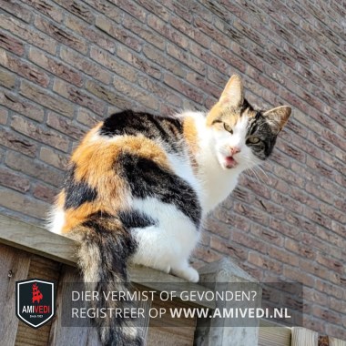| Signalement | Lapjes kat. Kop wit, rood om het rechter oog, zwart om het linkeroog, donkere stip op de kin. Rug zwart/rood gevlekt. met wat wit. Staart zwart/rood. |