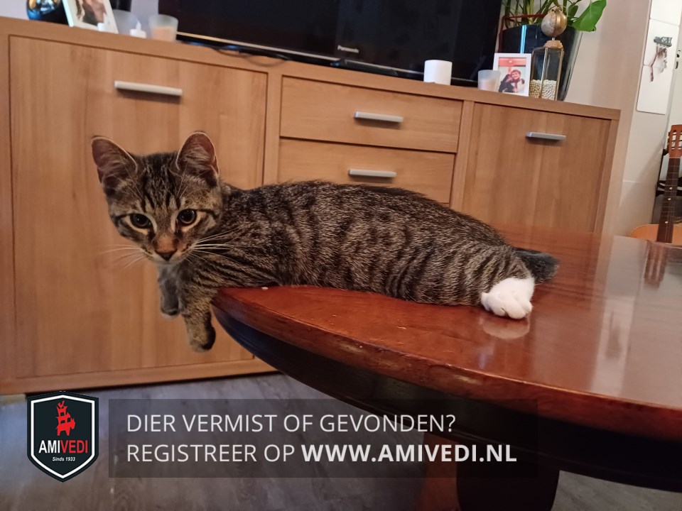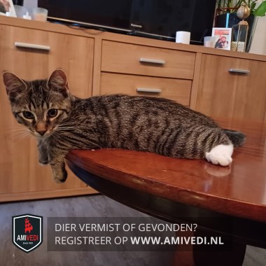 | Signalement | Cypers bruin/zwart, wat lichter om de bek, lichte oogstrepen, achterpoot links witte sok. |
