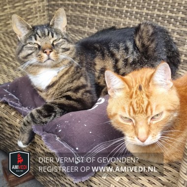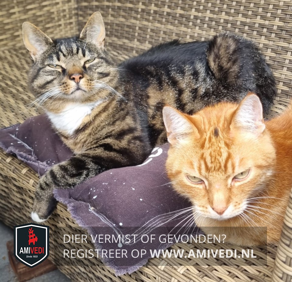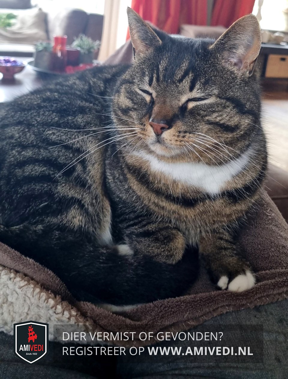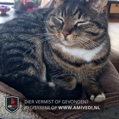 | Signalement | Cypers bruin-zwart gestreept met wit. Witte bef en witte tenen. Meegelift van Grootschermer naar Stompetoren, Erf. |