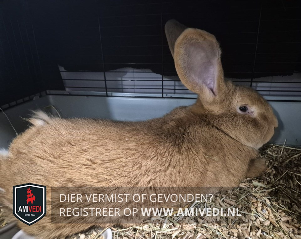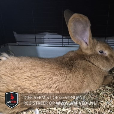| Signalement | Bruin. Geheel egaal lichtbruin, grote opstaande oren. Ras: Vlaamse reus. |
