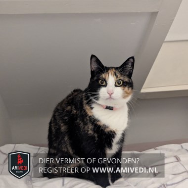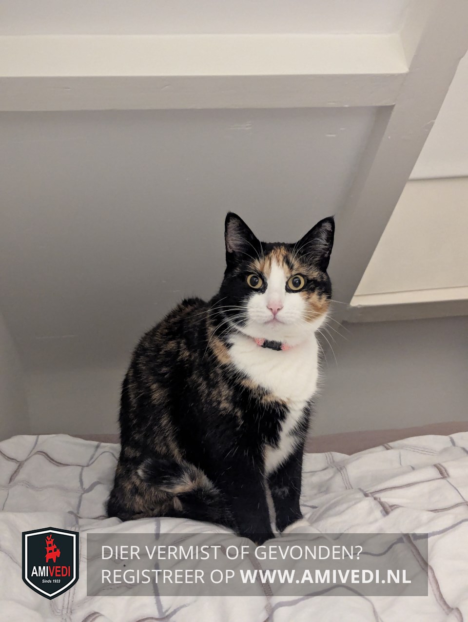 | Signalement | Zwart met rood/oranje en witte lapjeskat, , witte neusbrug, wit bekje, witte bef en borst. rug zwart met iets rood/oranje erdoorheen , voorpoten zwart met linker voorpoot wit voetje, staart ook zwart met rood/oranje |