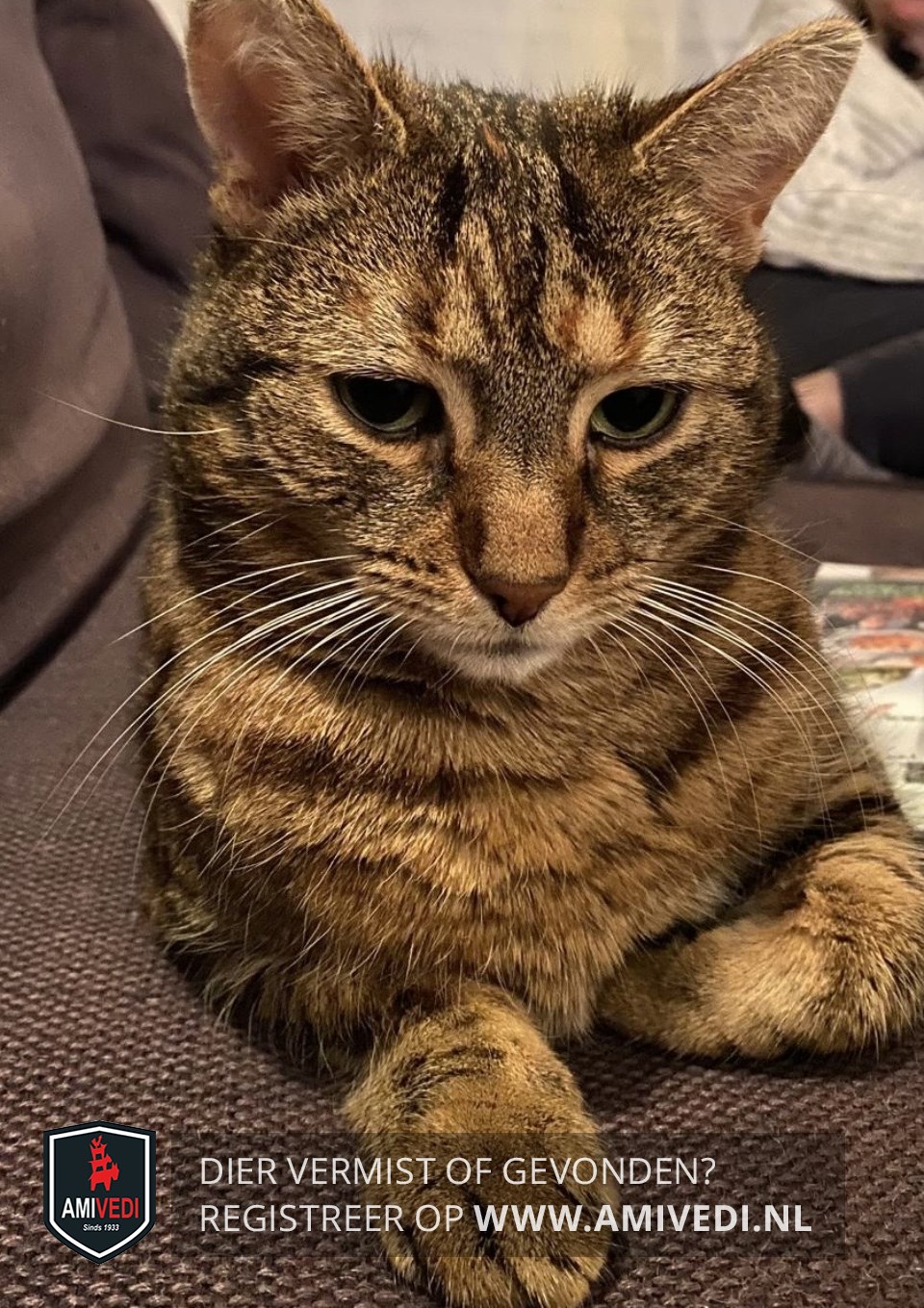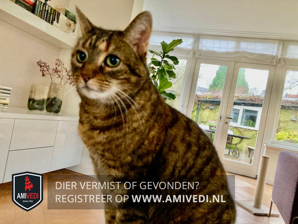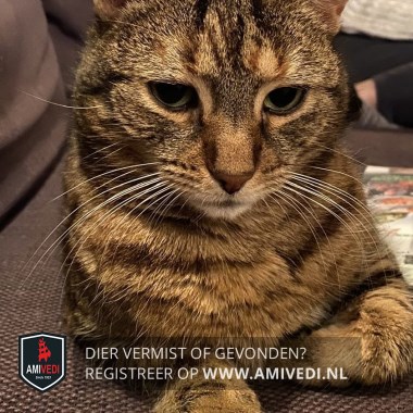 | Signalement | Cypers bruin - zwart met wit, cyperse oren en kopje met een licht vlekje bij de M tekening op het voorhoofd. links lichte ooghoek, om beide ogen lichte randjes, wit onder de neus, witte snorharen, witte kin, bruine borst met cyperse lijnen, lijf en poten zijn cypers, staart in ringpatroon, klein gebouwd. |