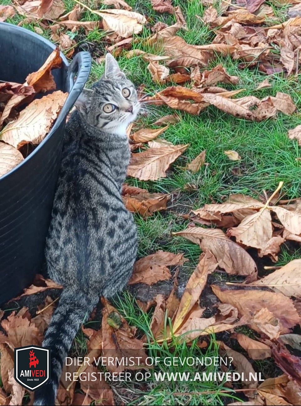 | Signalement | Grijs/ zwart gestreept met wit. Witte kin, hals, bef, tenen voorpootjes, sokken achterpootjes. Staart is grijs/ zwart geringd met zwarte punt. |