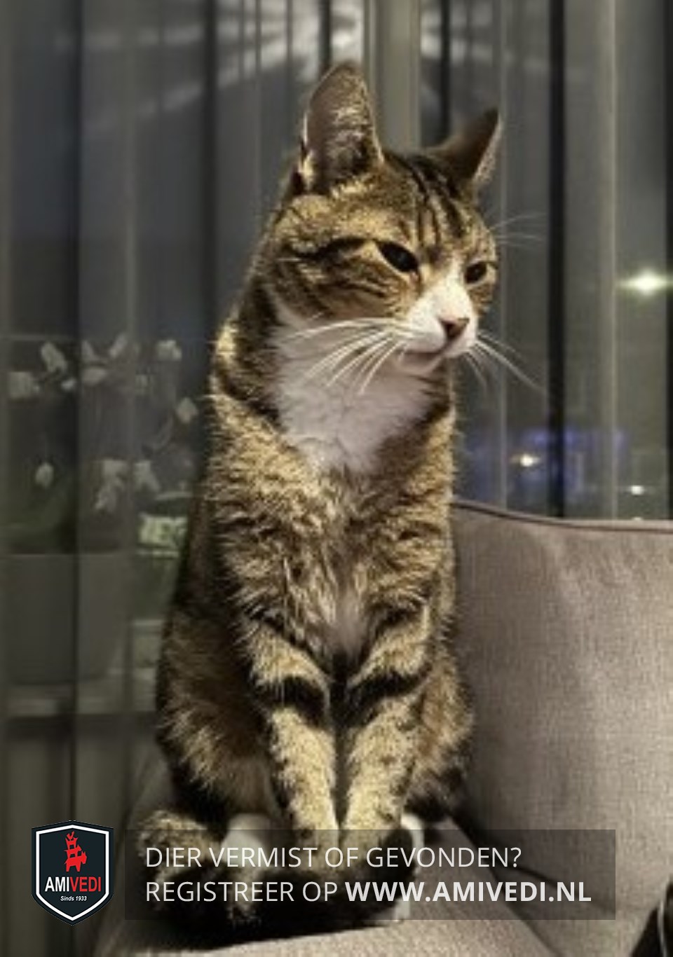 | Signalement | Cypers kopje tot op de wangen. Klein wit blesje. Wit snuitje, zwart rond neusje en kinnetje. Witte bef. Lijf gemarmerd. Witte teentjes voor. Witte laarsjes achter. Geringde staart, zwart aan punt. |
