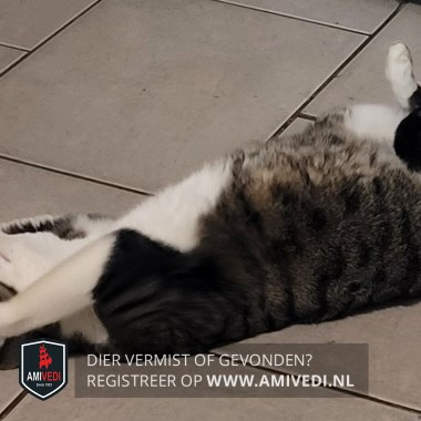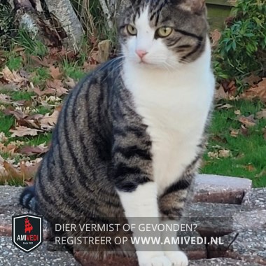 | Signalement | Grijs/ zwart gestreept met wit. Witte snuit, hals, bef, borst, buik ( deels wit) Hij heeft een wit driehoekje op z'n voorhoofdje. Zn rechter voorpootje heeft een wit kniekousje, z'n linker voorpootje heeft een wit sokje. Achterpootjes witte sokjes. |
