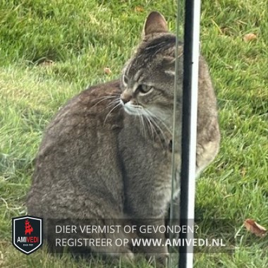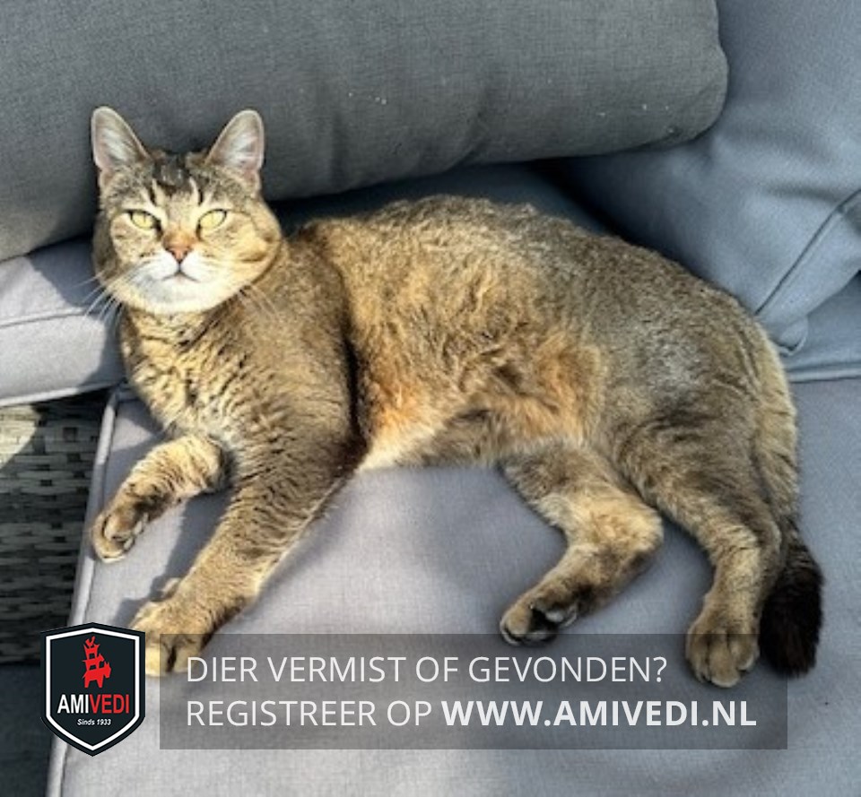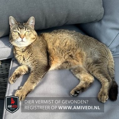 | Signalement | Redelijk grote poes. Grijskleurige, getickte vacht met wit Onder de neus bij de snorharen en witte kin. Zwarte punt staart. Ze is een Chausie. |
