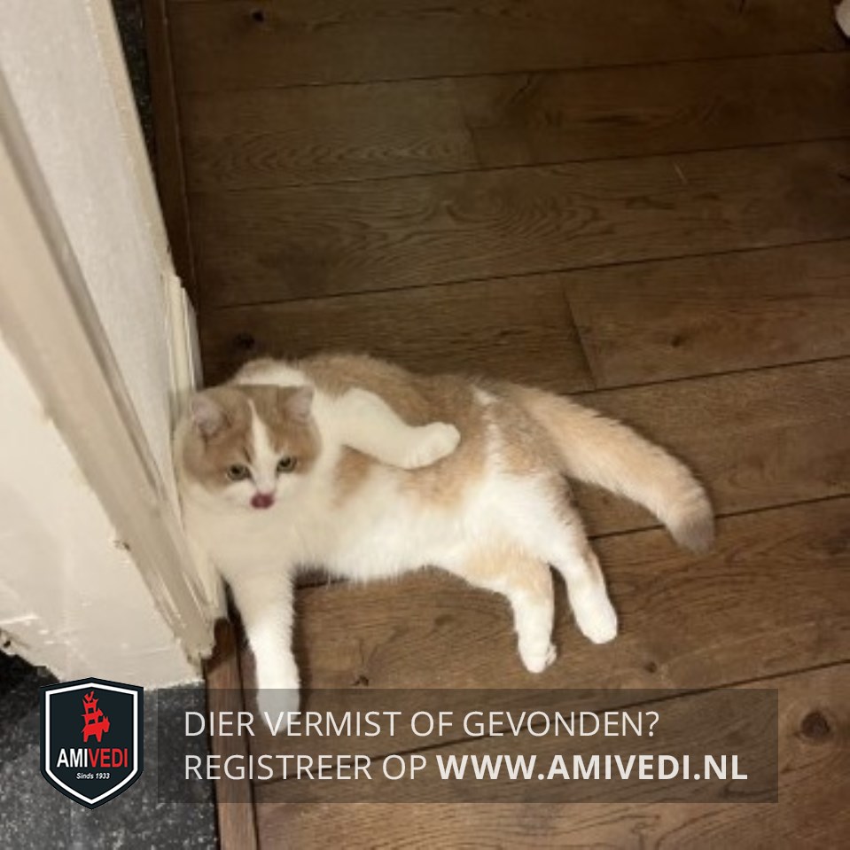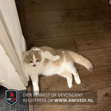| Signalement | Wit met bruin-beige boven de ogen, op kopje, rug en staart, bruin topje aan staart. |