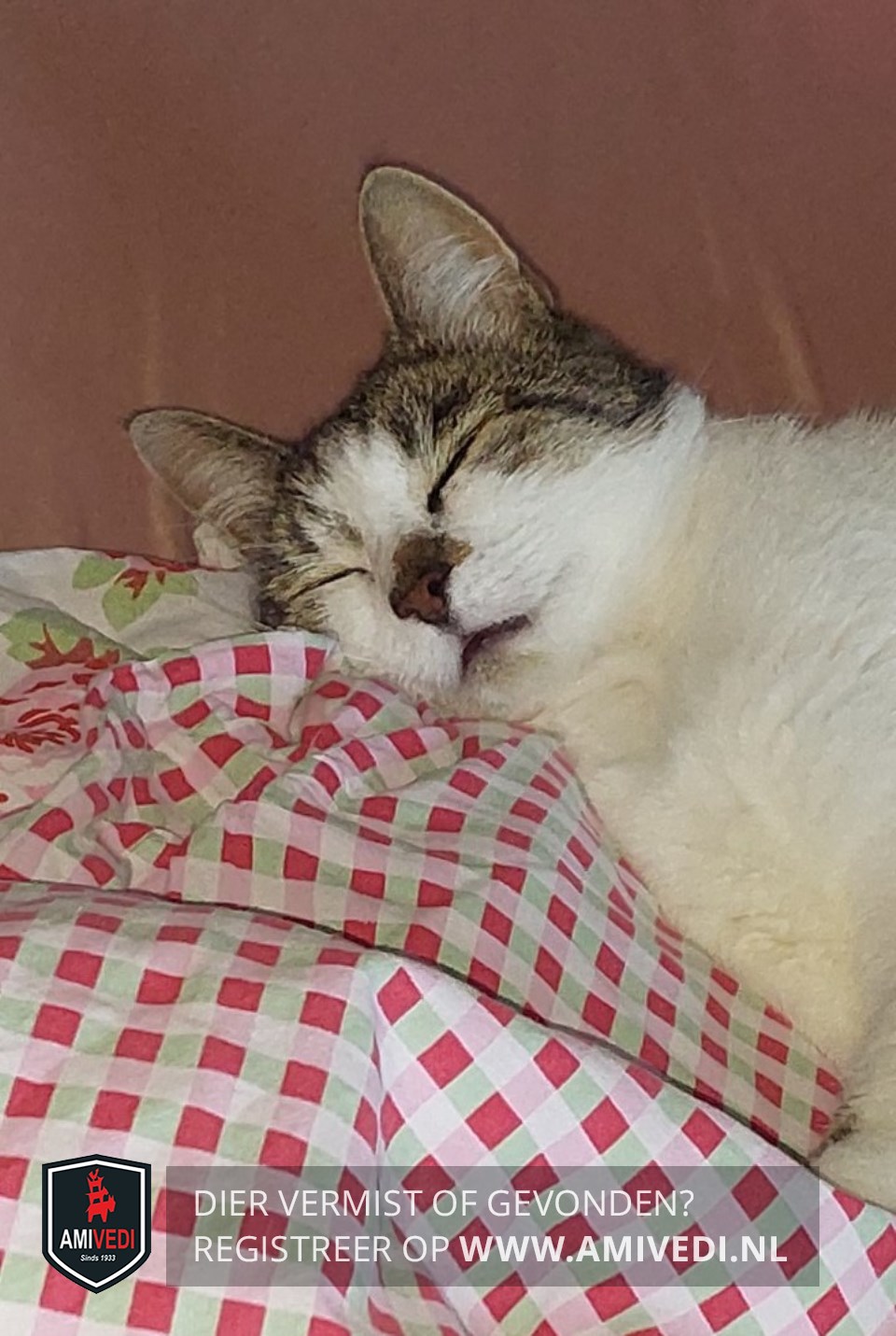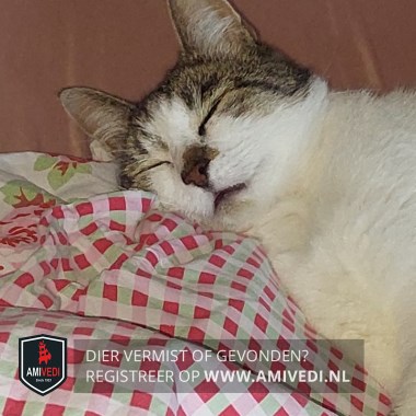 | Signalement | Wit met cyper bruin/zwarte vlekken. Bovenop de kop, incl oren en half over de beide ogen cypers. Links boven de neus cyperse vlek. Neus donker bruin. Onder de mond is de vacht klein beetje bruin. Dikke kater. Bang aangelegen en verstopt zich daardoor. |