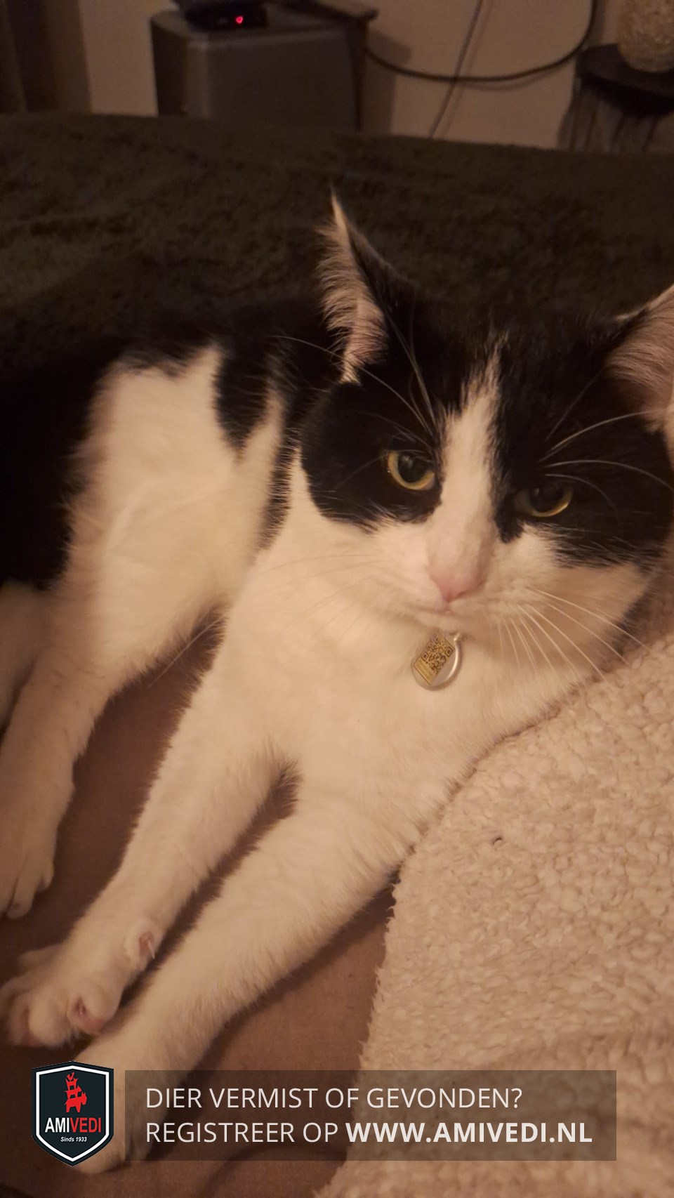 | Signalement | Wit met zwart rond de ogen en op kopje, zwart op rug en staart. |