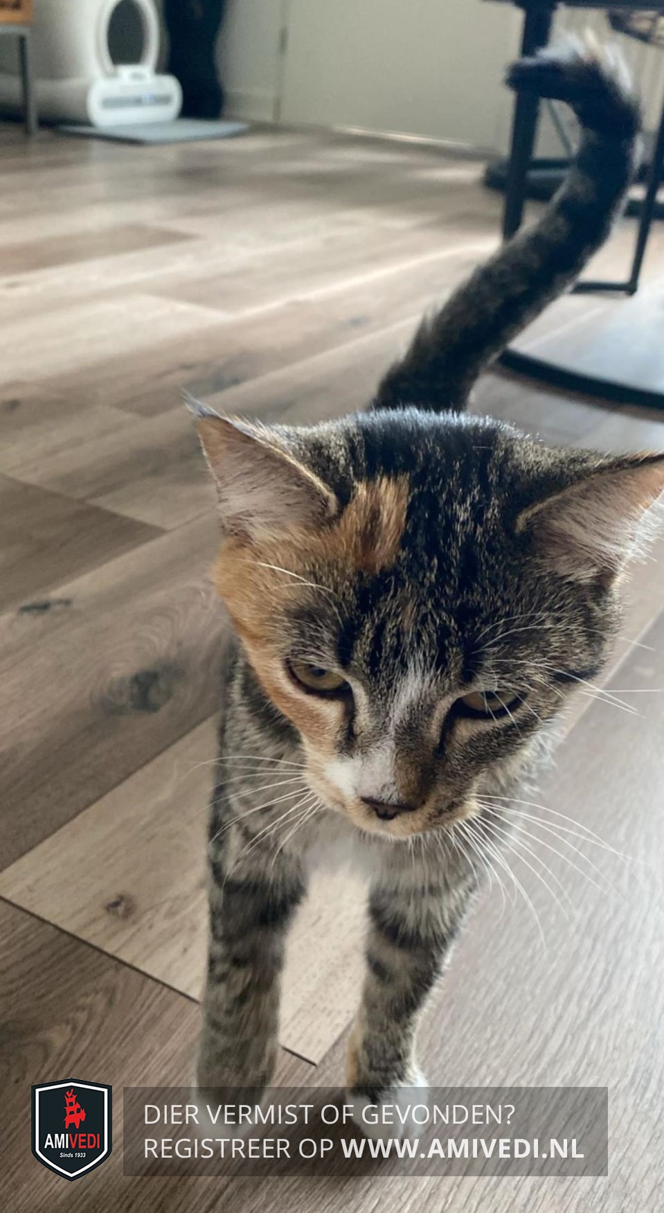 | Signalement | Cypers grijs/bruin/zwart poesje. Rechts op het kopje veel rood dat doorloopt over de slapen en onder het oogje. Lichte rand om de oogjes. Beetje wit op de neus, wit rond het bekje, witte kin en witte sokjes. Beetje bol hoofdje en heeft verschillende kleuren vacht. Pip valt op omdat haar ene helft van haar gezicht een bleekvlekje heeft en ze heeft lange wimpers. Grijze vlooienband. |