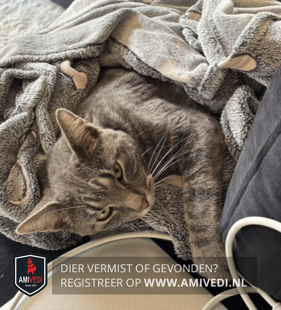 | Signalement | Cypers bruin/grijs/zwart katertje, bruin neusje, beige op de lippen. Redelijk klein en smal. Rond de 5 kilo. Staat hoog op zijn pootjes en heeft 2 kleine stipjes op zijn neus. |