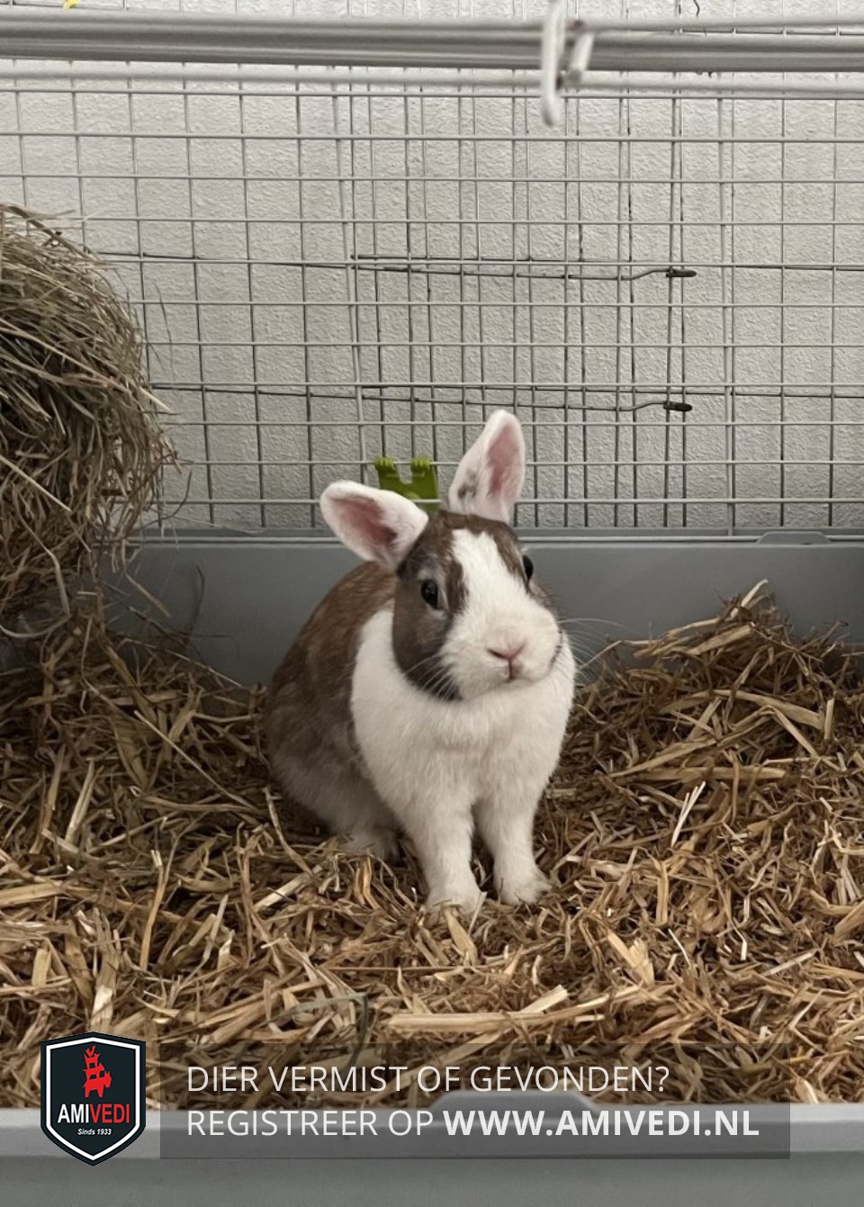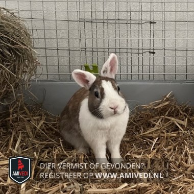 | Signalement | Konijntje, korte opstaande oren in wit; bruin langs de ogen, witte neus, snoet en kin; voorste helft lijfje en pootjes wit, achterste helft bruin, wat lichter naar de buik toe |