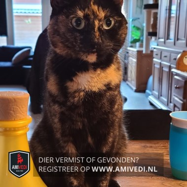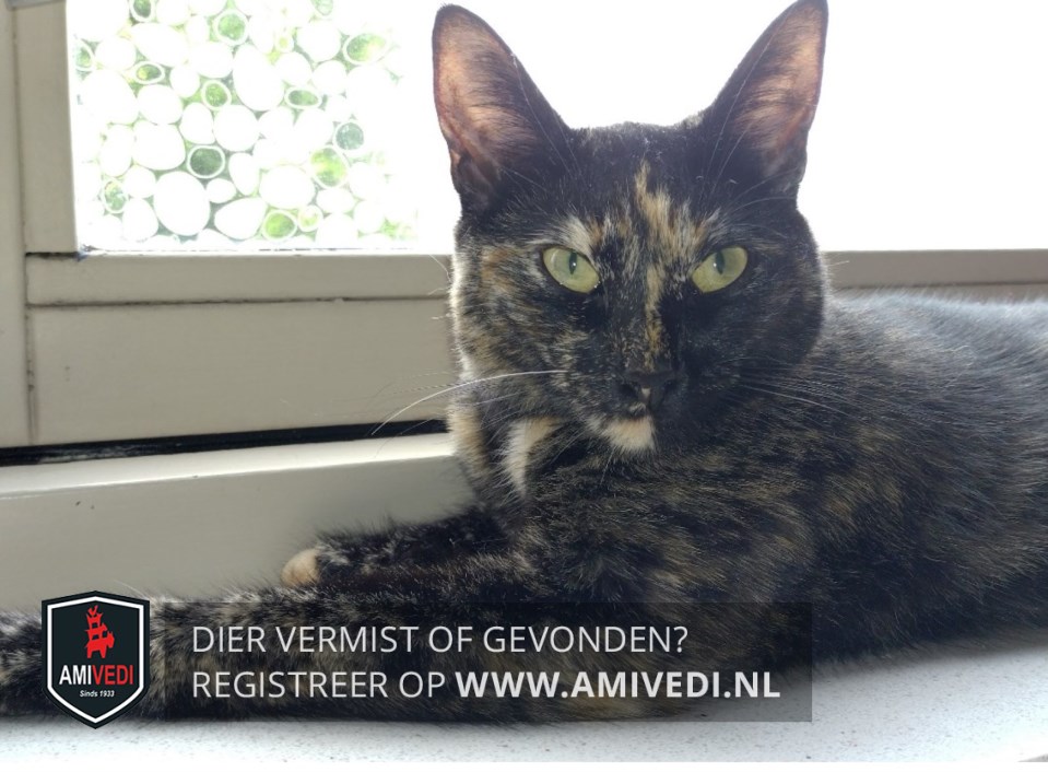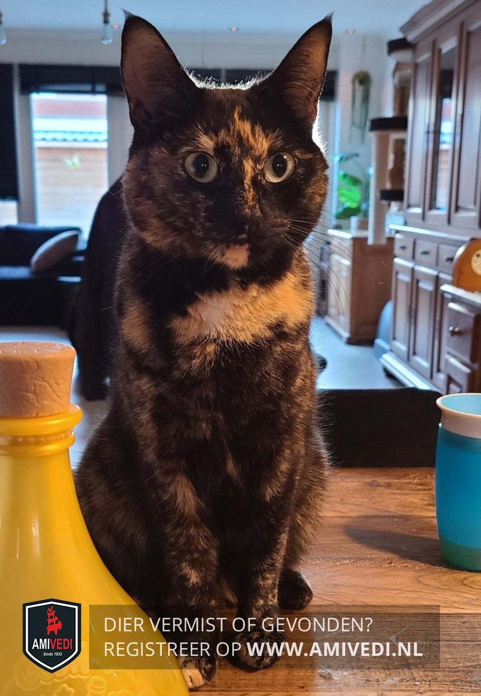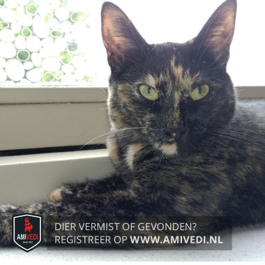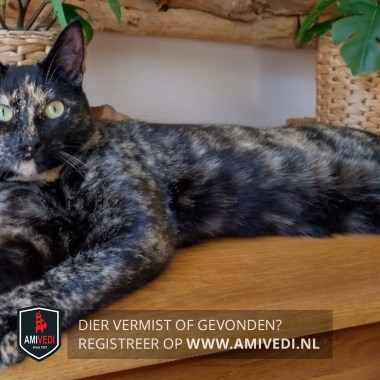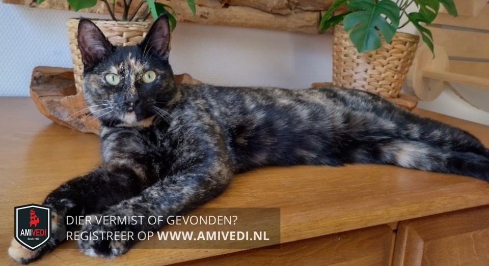 | Signalement | Schildpad-poes. Zwart petje, grote oren, groene ogen, lichtbruine vlek op de bles en en een lichtbruin streepje op de neusbrug. Rechterdeel van de kin beige, links zwart, zwarte bef en beige baan over de borst. Rest van het lijf en de pootjes zwart/bruin gemêleerd met beige teentjes aan de rechter voorpoot. |