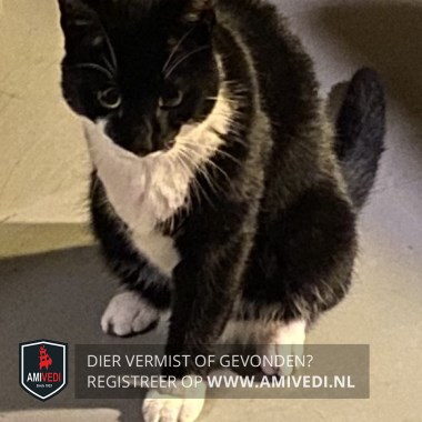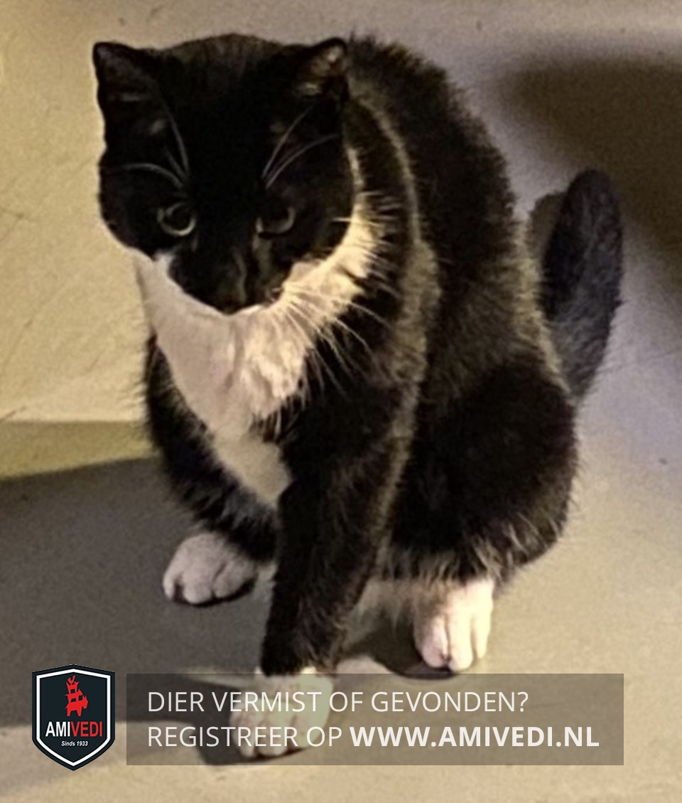 | Signalement | Zwart, witte kin, borst en voetjes, hij mist zijn rechter voorpoot. Verder staat zijn bek iets scheef. |