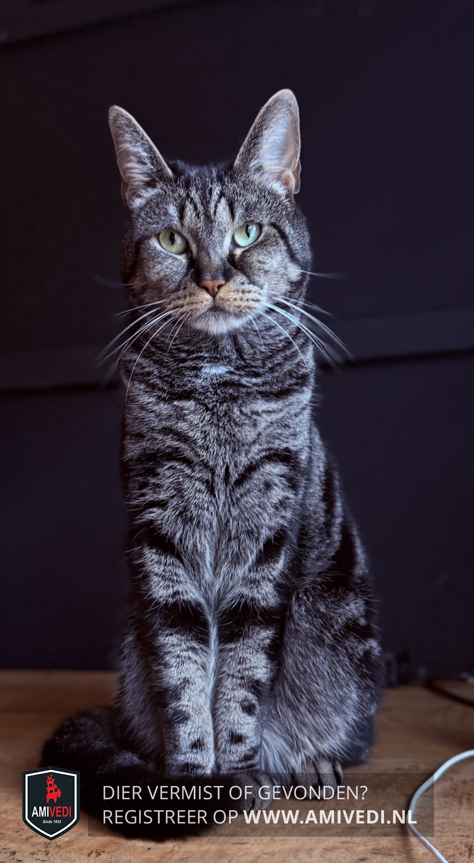 | Signalement | Cypers grijs-zwart gestreept, best grote kater. Tenger gebouwd. |