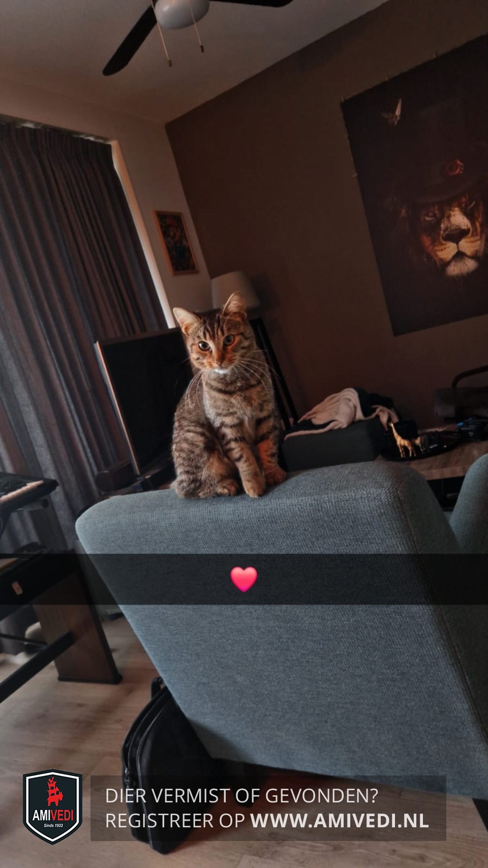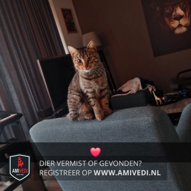 | Signalement | Cypers bruin-zwart/grijs, groene ogen, buikwond ivm sterilisatie. |